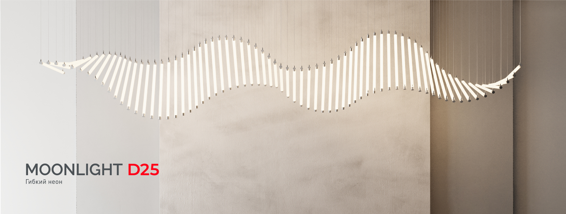 Гибкий неон MOONLIGHT с диаметром 25 мм обладает равномерным свечением, направленным на 360°. С помощью MOONLIGHT D25 возможно создать локальное и даже основное освещение, а также оригинальные арт-объекты. 3D-инсталляции на основе круглого гибкого неона гармонично впишутся в гостиные, кухни, детские, а также в коммерческие пространства.