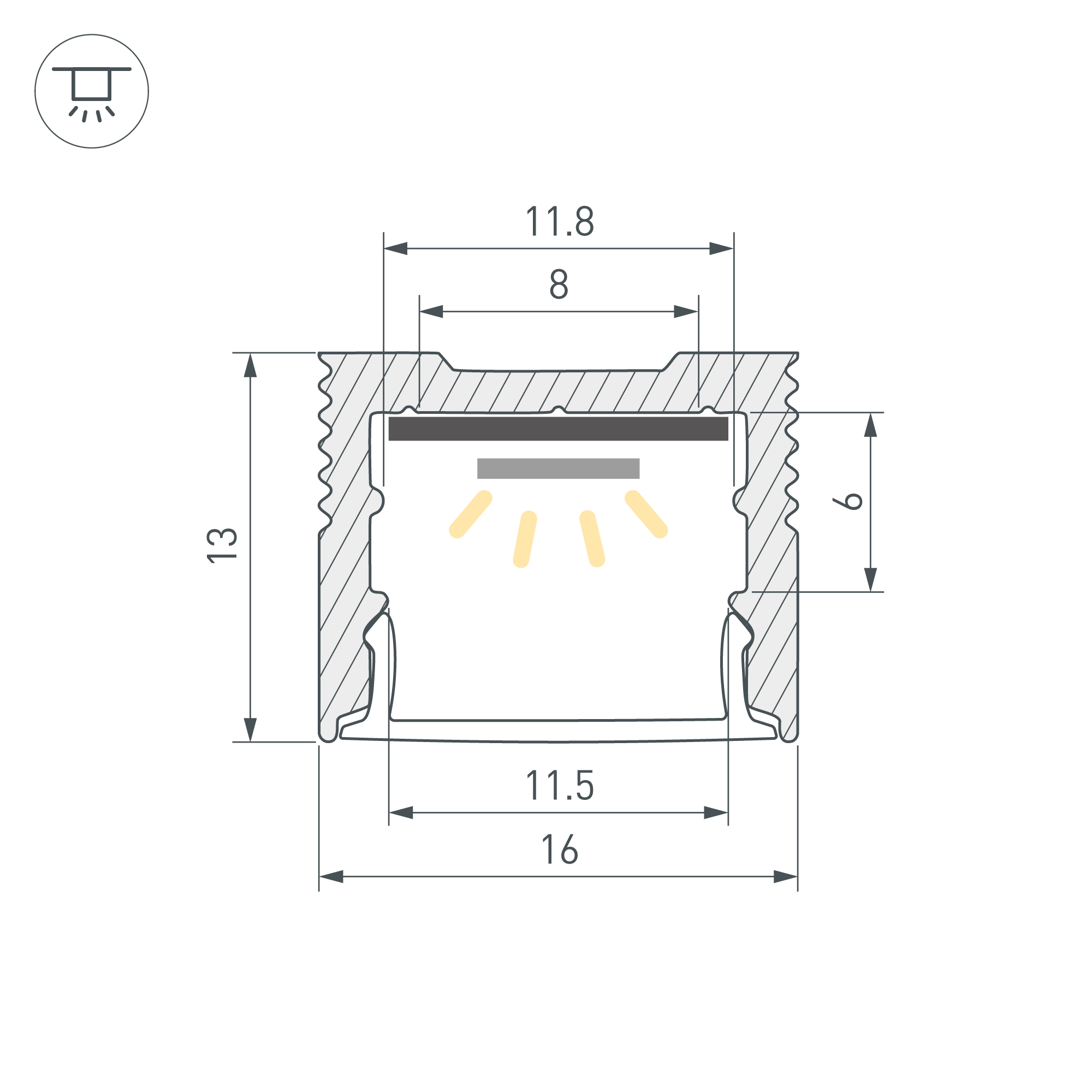 Накладной профиль из анодированного алюминия в комплекте с матовым экраном со светопропусканием 63%, заглушками и держателями для декоративного освещения интерьера. Габаритные размеры профиля составляют 2500 мм в длину, 16 мм в ширину и 13 мм в высоту. Площадка для установки светодиодных лент позволяет использовать ленту шириной до 11,8 мм и мощностью до 15,2 Вт/м. Это обеспечивает гибкость в выборе светодиодных лент и создает потрясающие световые решения.