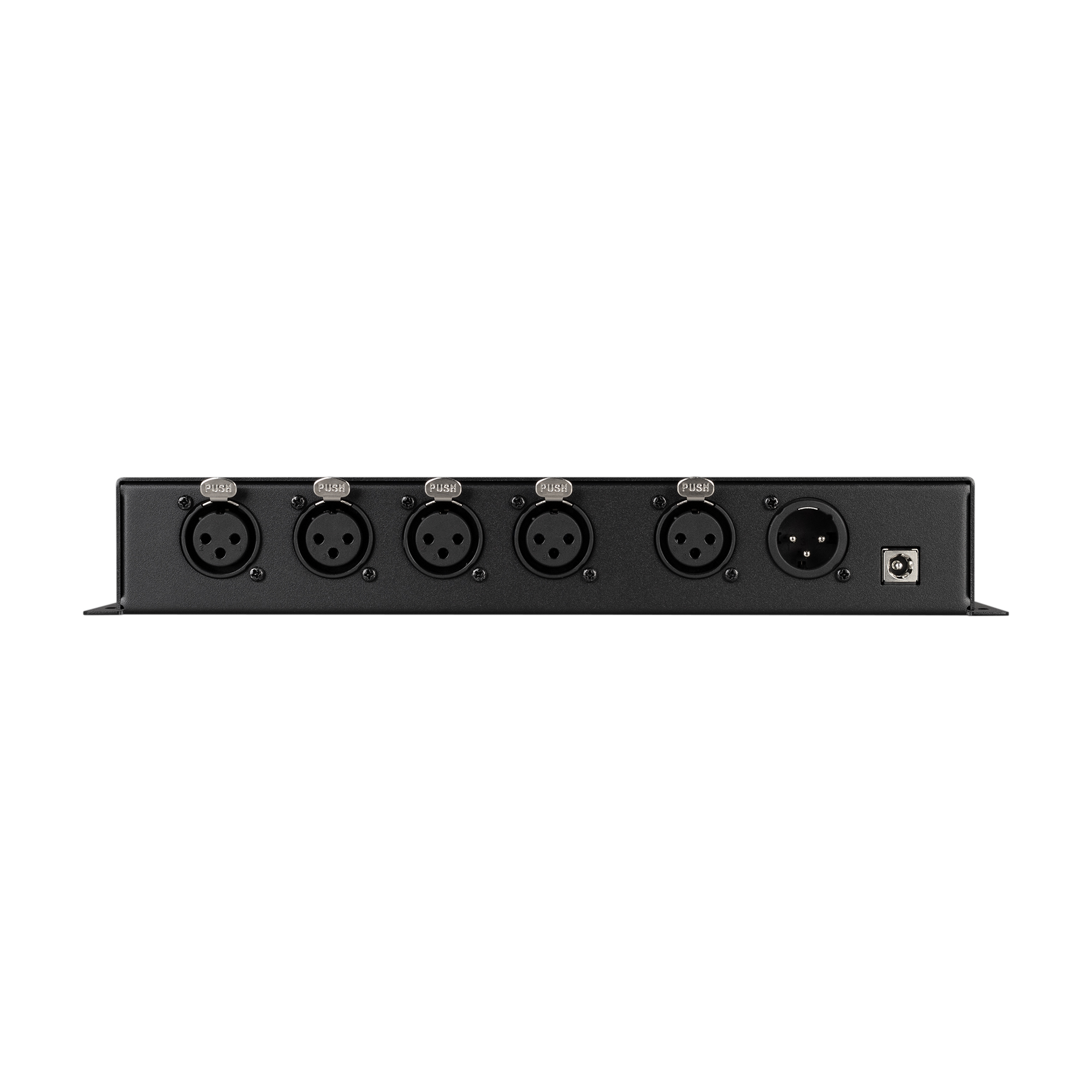 Сплиттер (усилитель) DMX512 сигнала. Вход - 1 порт DMX512, выход - 4 порта DMX512. Напряжение питания DC 12-36V, разъемы XLR3. Габариты 256х92х38 мм.