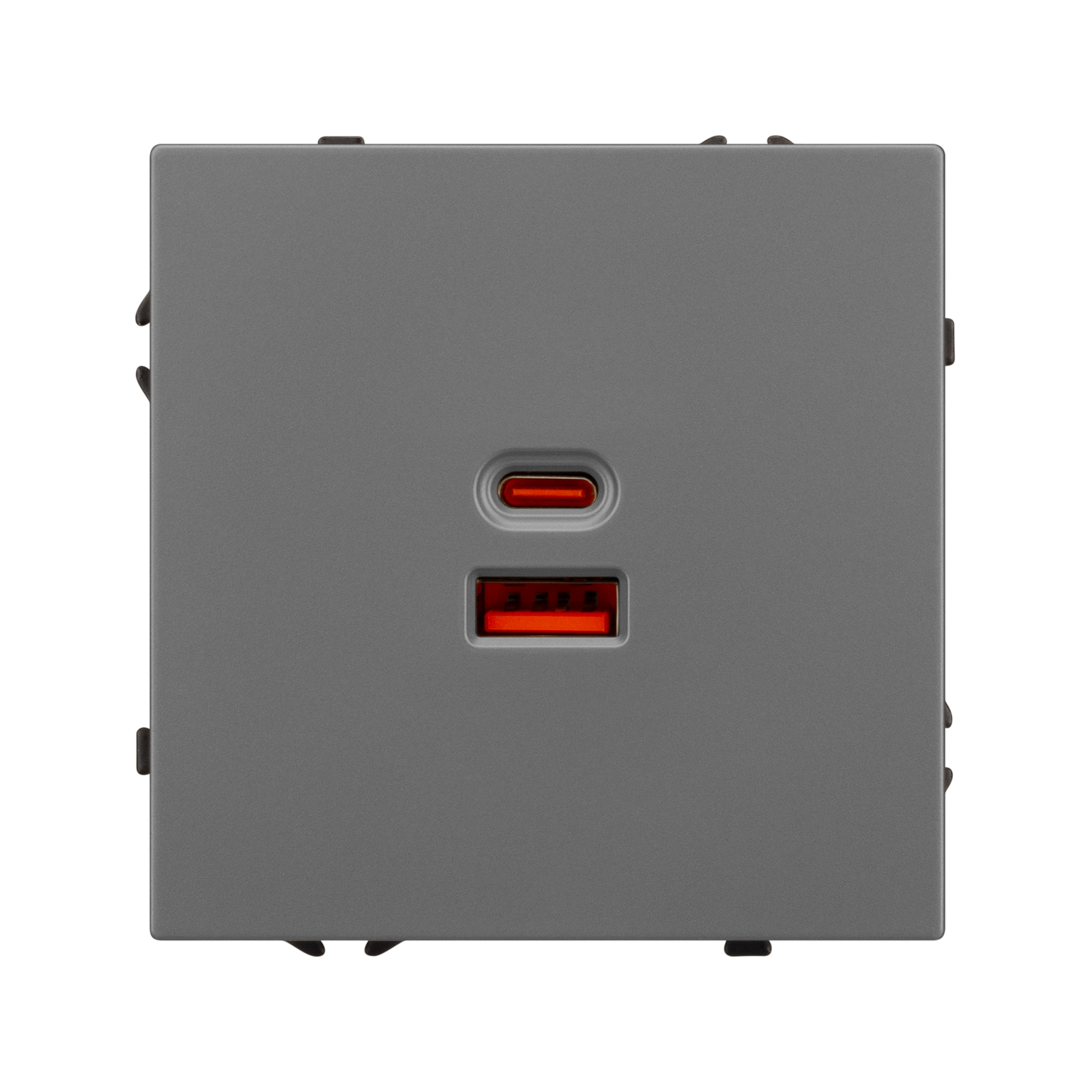 Механизм розетки с быстрой USB зарядкой на 2 порта. Цвет - серый базальт, с Soft-Touch покрытием. Без фронтальной рамки. Уровень пылевлагозащиты IP20. Тип подключаемого разъема - USB Type A + Type C. Устанавливается в стандартный подрозетник круглого сечения диаметром 60мм. Габаритные размеры: длина 71 мм, ширина 71 мм, высота 42 мм. Гарантийный срок 10 лет.