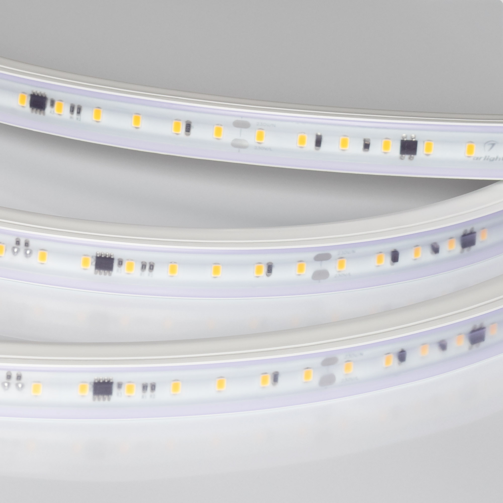 Светодиодная герметичная лента ARL серии A84 со степенью защиты IP65, защитная оболочка из ПВХ устойчива к УФ излучению. Высокий индекс цветопередачи CRI>85 обеспечивает точное восприятие цветовых оттенков. Лента подключается непосредственно к сети переменного тока 230 В и не требует использования источников питания. Наличие интегральных стабилизаторов тока позволяет подключать ленту длиной до 50 м, обеспечивая при этом равномерную яркость свечения по всей длине ленты. При подключении нескольких лент необходимо подавать питание на каждые 50 м отдельным кабелем, последовательное подключение лент более 50 м запрещается. Лента применяется для декоративной подсветки помещений, потолочных ниш, создания контуров рекламных объектов внутри помещений. Ленты обладают низким коэффициентом пульсаций FlickerFree <2%. Для расчета потребляемой мощности необходимо учитывать коэффициент мощности - PF>0.75. На лентах установлены микросхемы с функцией снижения тока для защиты ленты от перегрева, обеспечивающие надежную работу в различных условиях. Диммирование в диапазоне 30%-90% осуществляется TRIAC диммерами с установкой минимального уровня яркости, при диммировании коэффициент пульсаций увеличивается. Крепление с помощью скоб, аксессуары для монтажа и подключения поставляются отдельно.