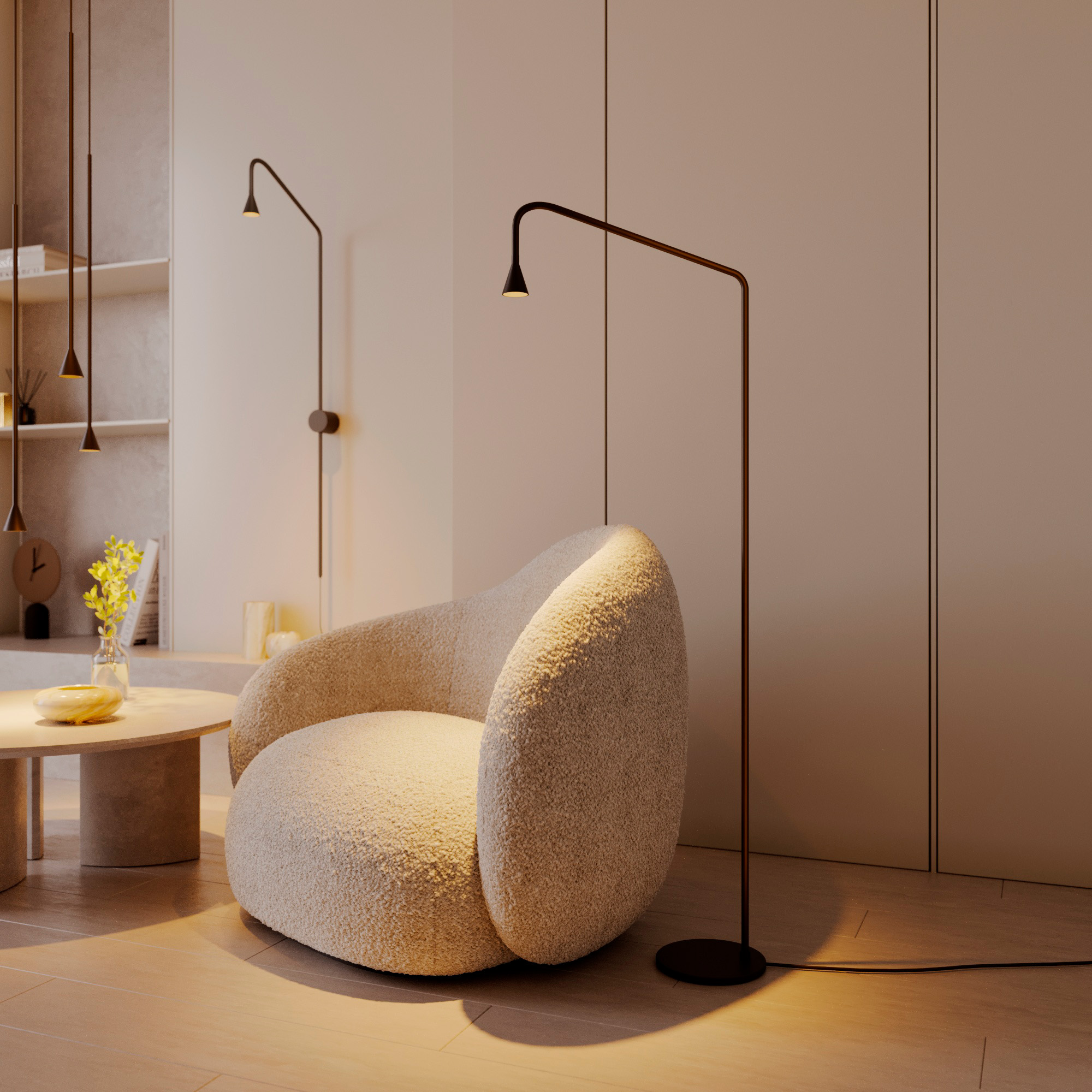 Декоративный напольный светильник. Мощность 5 Вт, св. поток 420 лм, 84 лм/Вт, теплый 3000К, CRI>94, угол 36°, напряжение питания 230 В. Черный корпус из алюминия, степень защиты IP20. Размер основания Ø200×10 мм, диаметр ножки Ø11,4, высота светильника 1400 мм, длина держателя светоизлучателя 420 мм, размер светоизлучателя Ø50×63 мм. Длина провода до выключателя 500 мм, от выключателя к розетке 1500 мм, питание от сети 220-240V. Драйвер 2-10 В, 500 мА, пульсация <1%.