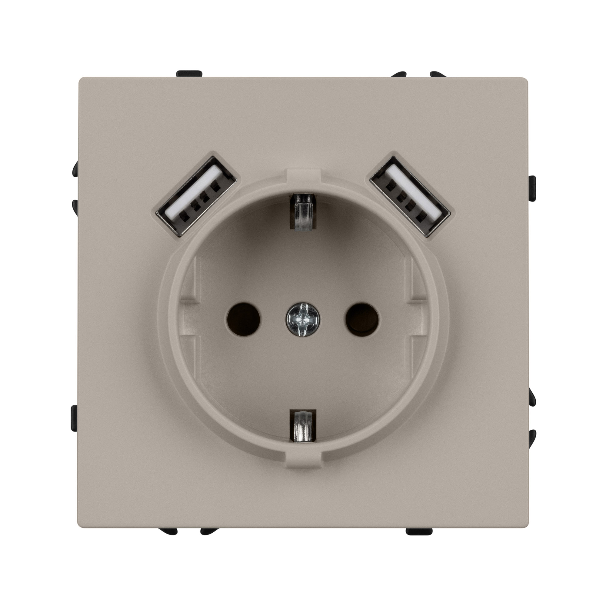 Строгие геометрические линии гармонично сочетаются с функциональностью продуманных механизмов, создавая идеальное решение для дизайн-проектов, где важны как эстетика, так и практичность. Механизм розетки с USB зарядкой, совместимый с рамками серии NOBE, создает утонченный минималистичный вид. Наличие двух USB Type A портов позволяет существенно сократить количество используемых розеточных постов под евровилку, сохраняя единую стилистику интерьера всего современного дизайн-проекта. Видимая часть механизма выполнена из высококачественного пластика цвета кашемир и имеет Soft-Touch покрытие, что придает изделию приятные тактильные ощущения и стильный внешний вид. Розетка оснащена заземляющими контактами и защитными шторками, обеспечивая надежное и безопасное подключение электроприборов. Контактная часть присоединяется при помощи винтовых зажимов, позволяя надежно подсоединить механизм выключателя к питающим элементам. А усиленные распорные лапки двойного захвата надежно фиксируют механизм в установочном подрозетнике круглого сечения диаметром от 60мм. Суппорт окрашен в черный матовый цвет под основу механизма и выполнен из металла толщиной 1,5мм, что обеспечивает безопасность и уверенность в установке. На каждой стороне суппорта размещены фиксирующие элементы, позволяющие комбинировать механизмы в системы до 5шт как горизонтально, так и вертикально.