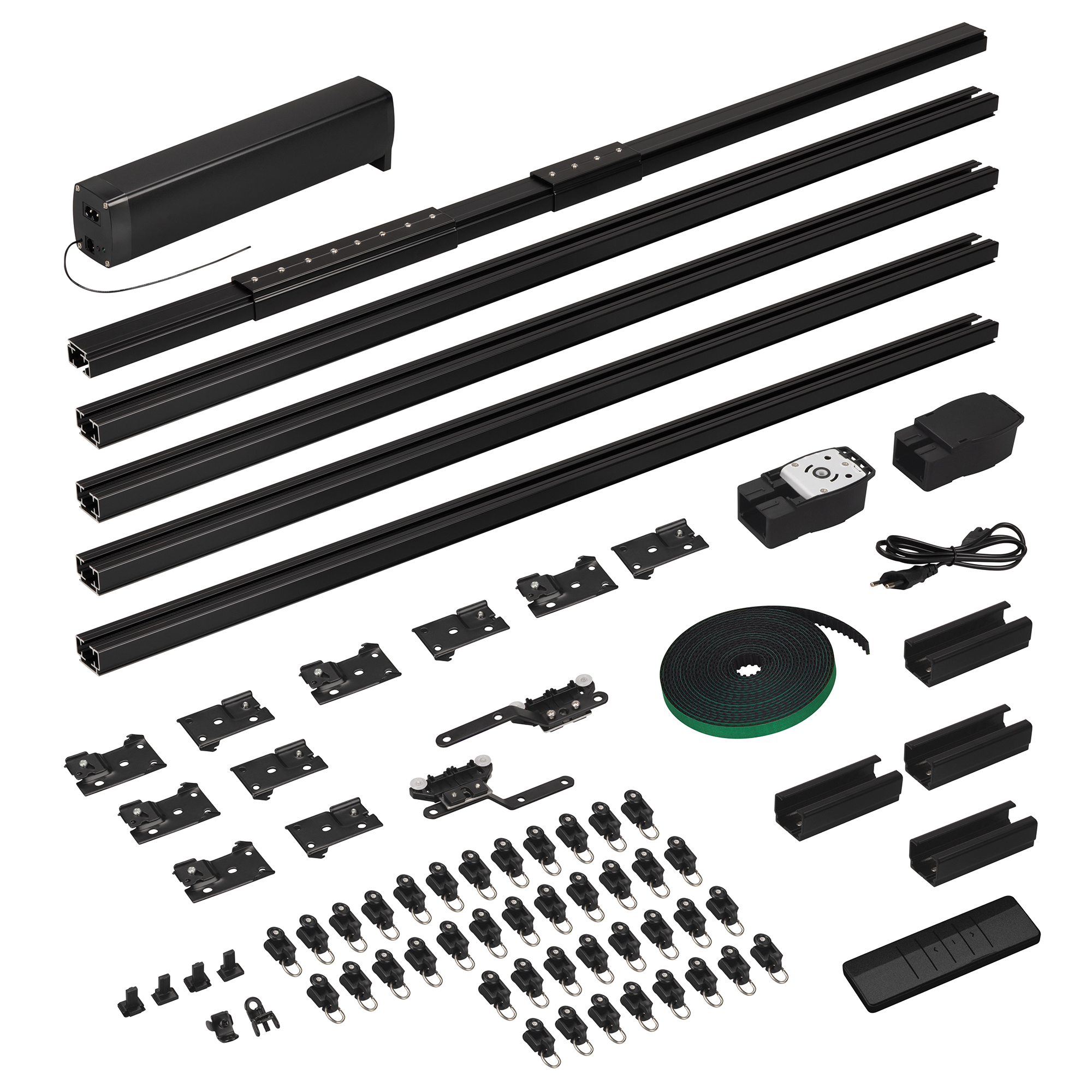 Комплект электрокарниза в черном цвете длиной до 5м (регулируется наборными частями) для раздвижных штор, состоящий из мотора, наборного алюминиевого трека, пульта и комплектующих. Электропривод с питанием 100-240В, мощность 45Вт, момент 1.2Нм, вес штор до 40кг. Управление с помощью пульта из комплекта, по WI-FI, 2.4ГГц, Bluetooth, "сухими" контактами на входе RJ45. Совместим с платформой TUYA, АЛИСА от ЯНДЕКС. Управление со смартфона через приложение SmartLife, с помощью пульта в комплекте.