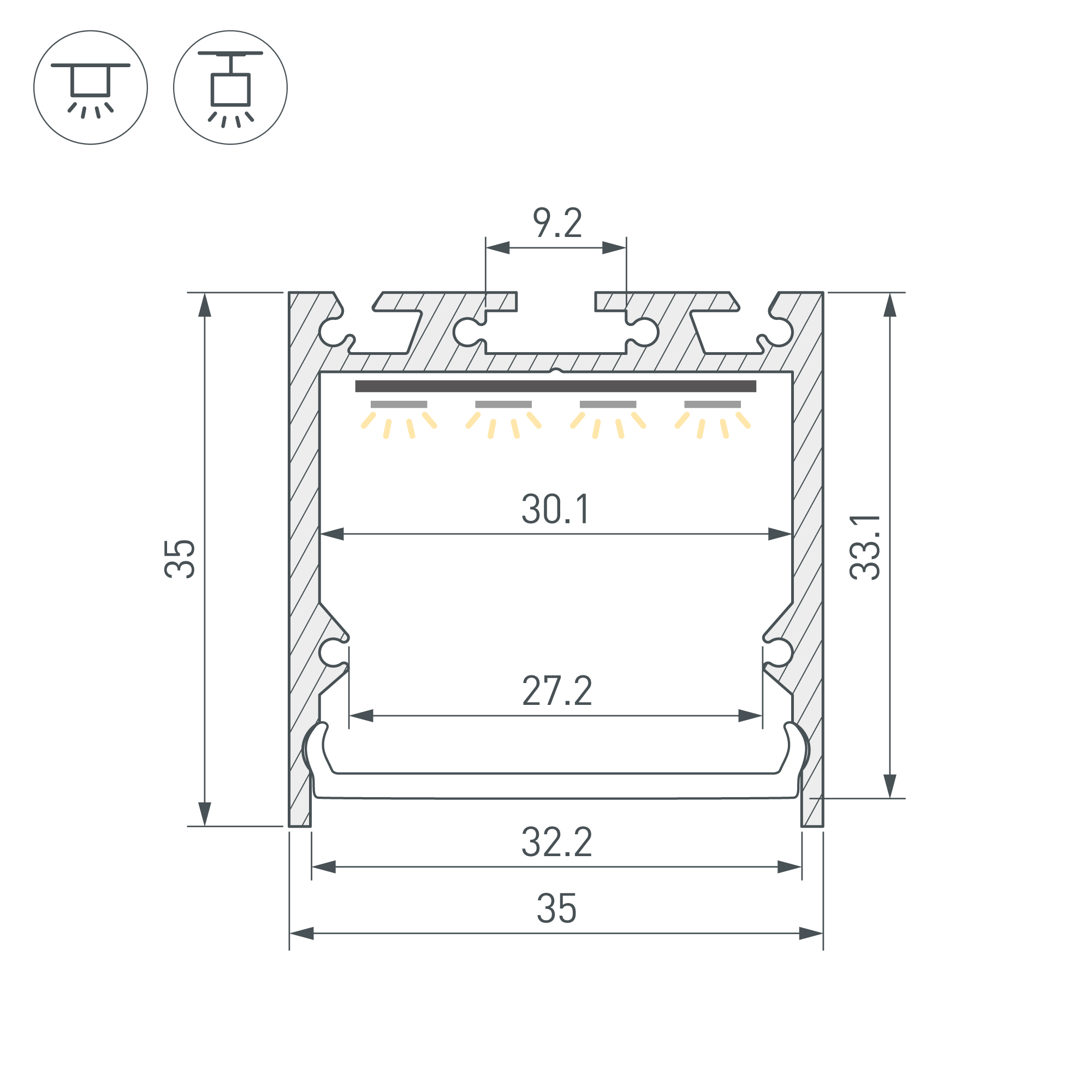 Подвесной/накладной профиль черного цвета из алюминия для основного освещения и контурной подсветки. Габаритные размеры профиля составляют 2000 мм в длину, 35 мм в ширину и 35 мм в высоту. Площадки для установки светодиодных лент позволяют использовать ленты шириной до 30,1 мм и мощностью до 36,7 Вт/м. Это обеспечивает гибкость в выборе светодиодных лент и создает потрясающие световые решения. Экраны, заглушки и другие аксессуары не включены в комплект и приобретаются отдельно. Цена указана за 1 метр профиля. Отличное решение для создания современных световых проектов.