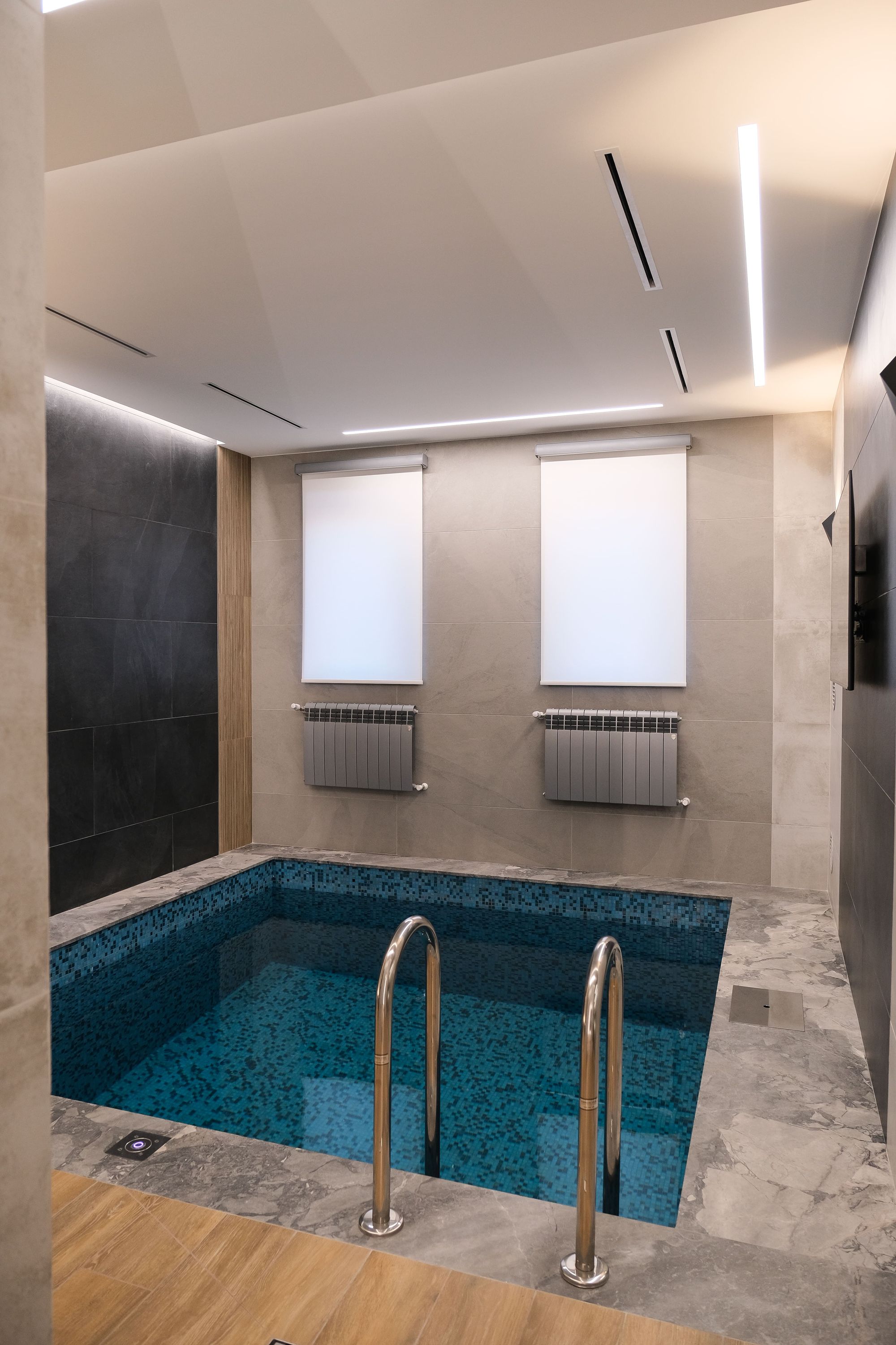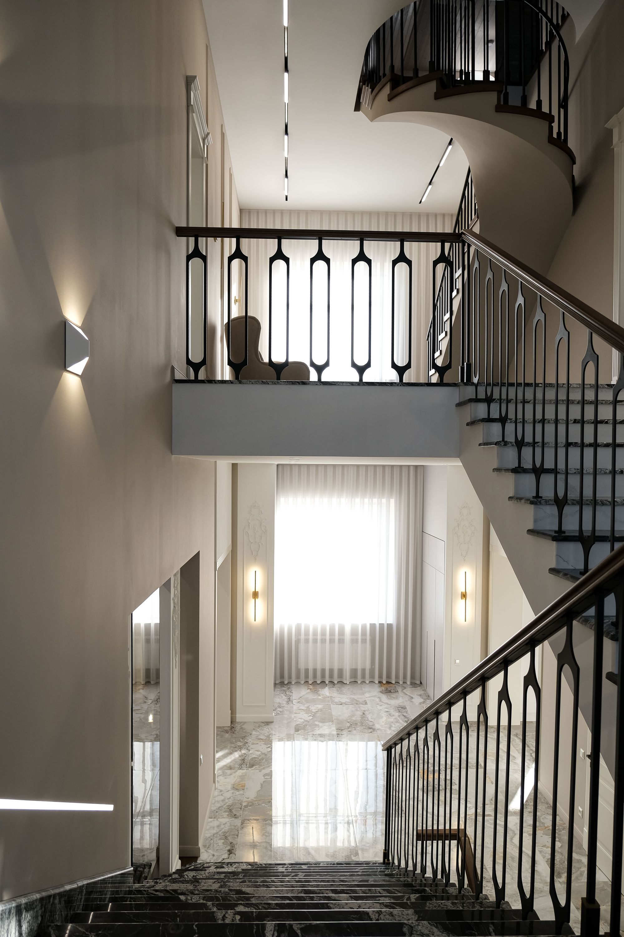 В интерьере частного коттеджа преобладает стиль неоклассицизм. Изящный молдинг, декоративные люстры, обилие мрамора и золотистые элементы фурнитуры грамотно интегрированы в пространство, благодаря чему в коттедже царит ощущение сдержанной роскоши. Однако интерьер остается современным и функциональным, что отчетливо прослеживается в подборе источников освещения.