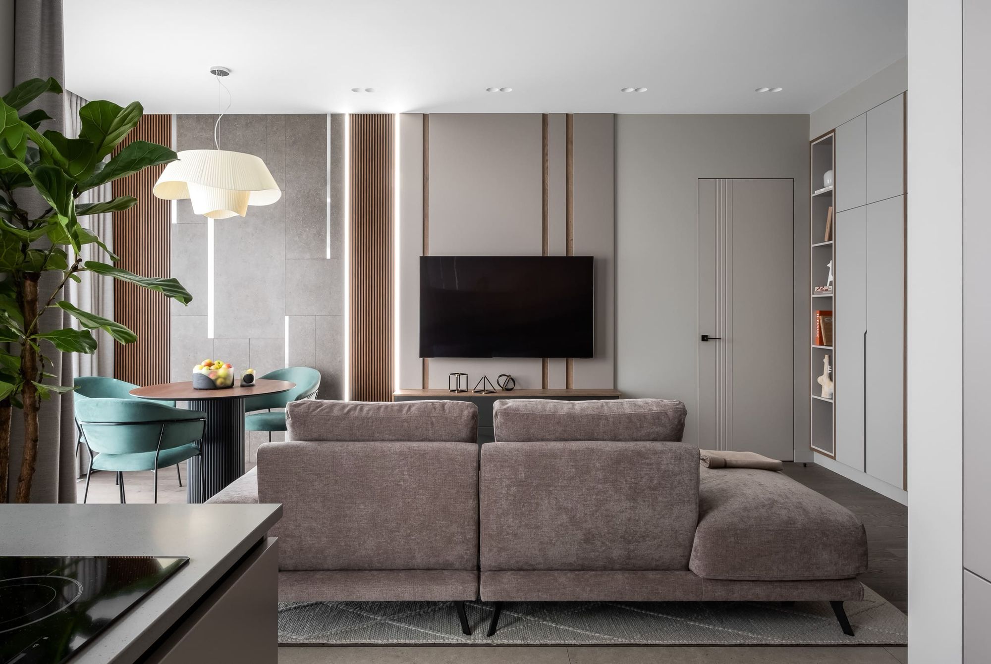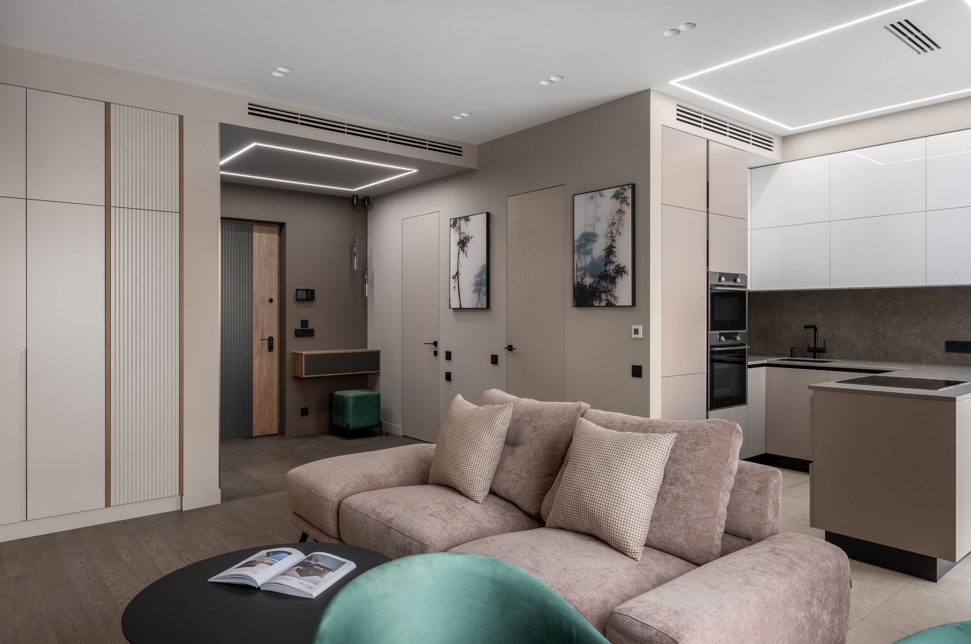 В проекте применяются линии света на основе светодиодных лент с очень высоким индексом цветопередачи (CRI>98), что приближает их свечение к естественному солнечному свету. Благодаря этому пастельные оттенки в интерьере сохраняют свою глубину и насыщенность даже при искусственном освещении.