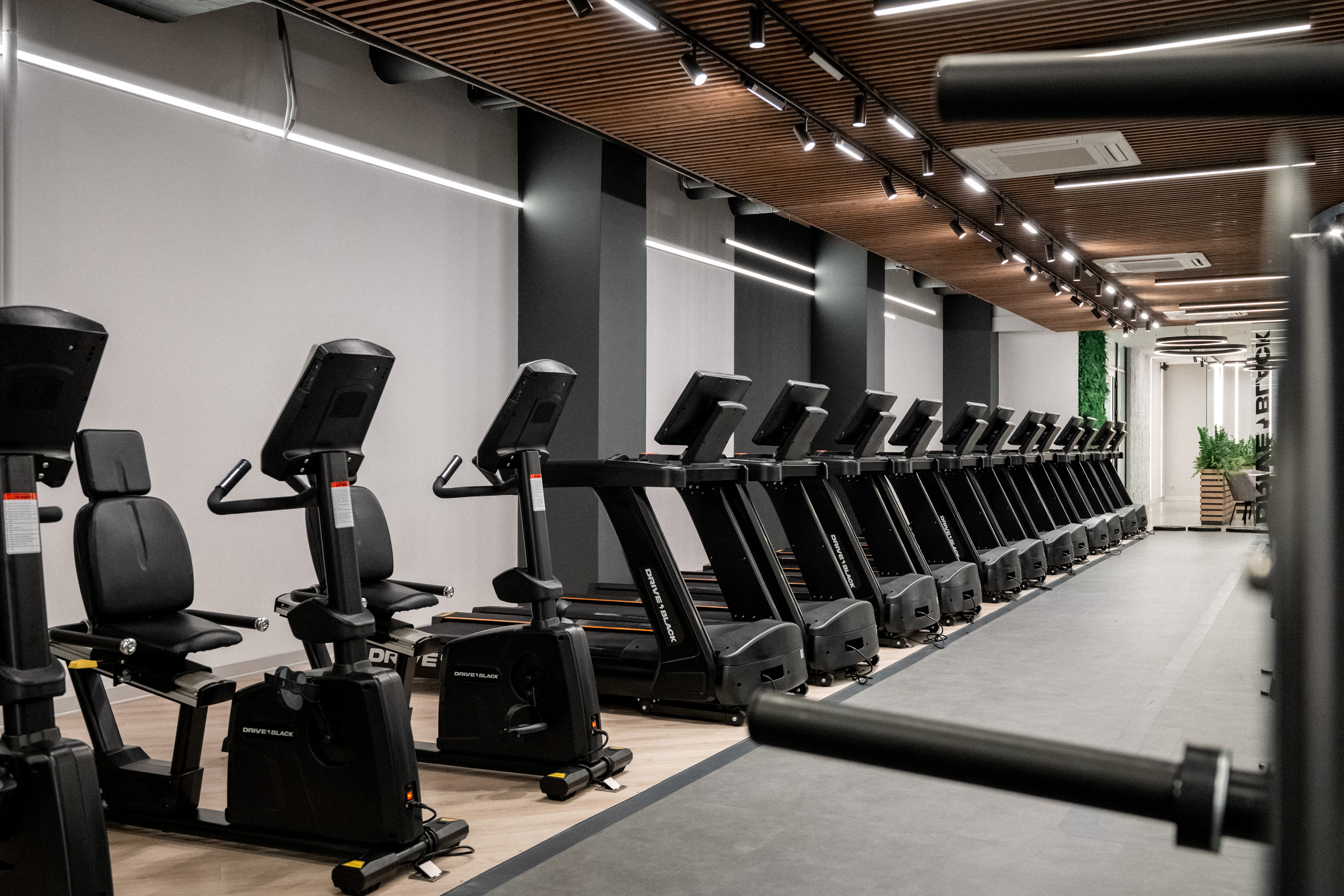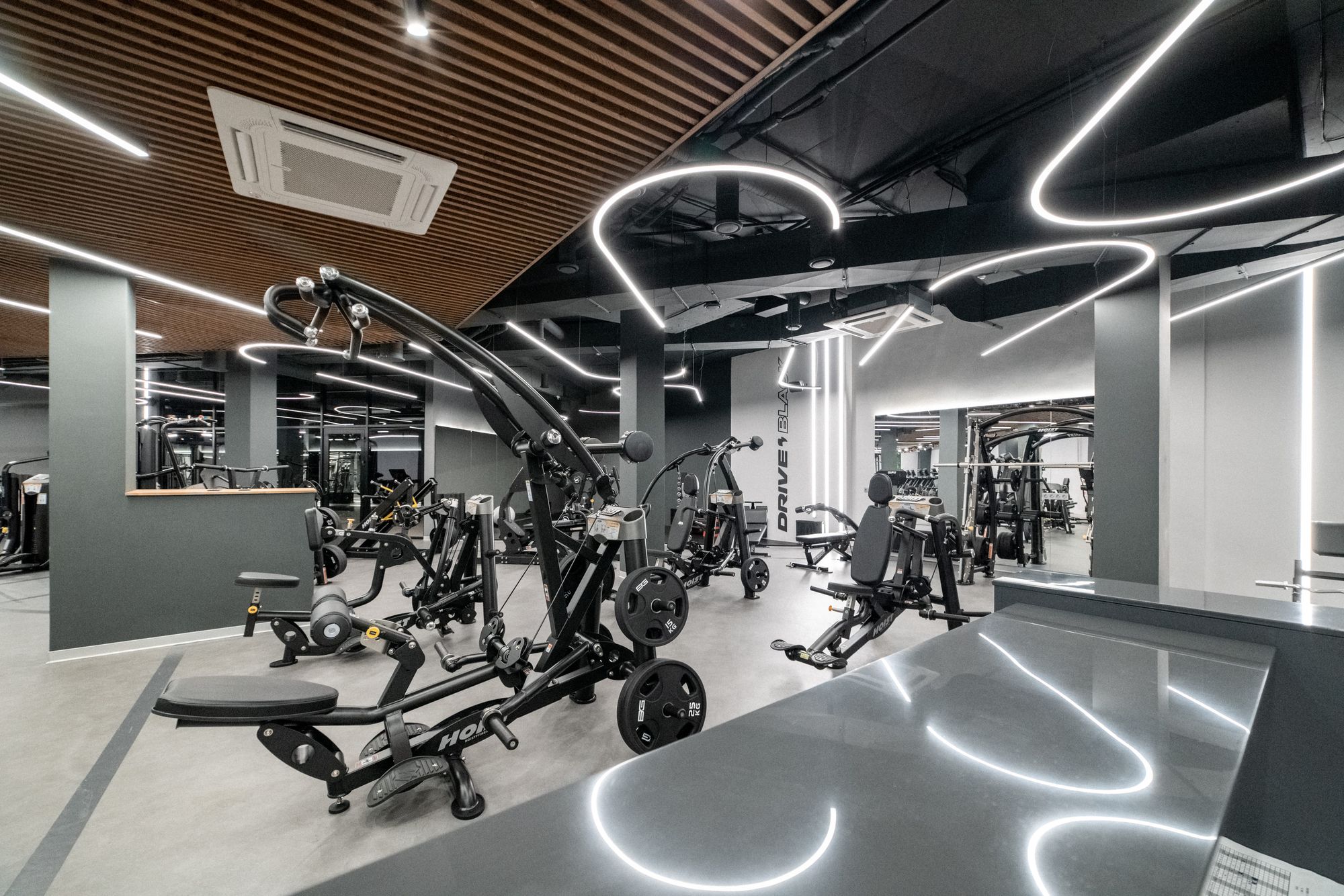 Пространство фитнес-клуба премиум-класса Drive Black пронизано световыми линиями, которые словно ведут клиента за собой. За счет радиусных моделей профиля ARC и широких лент RZ с платой в форме волны удалось создать плавные повороты линий света и полукруглые композиции.