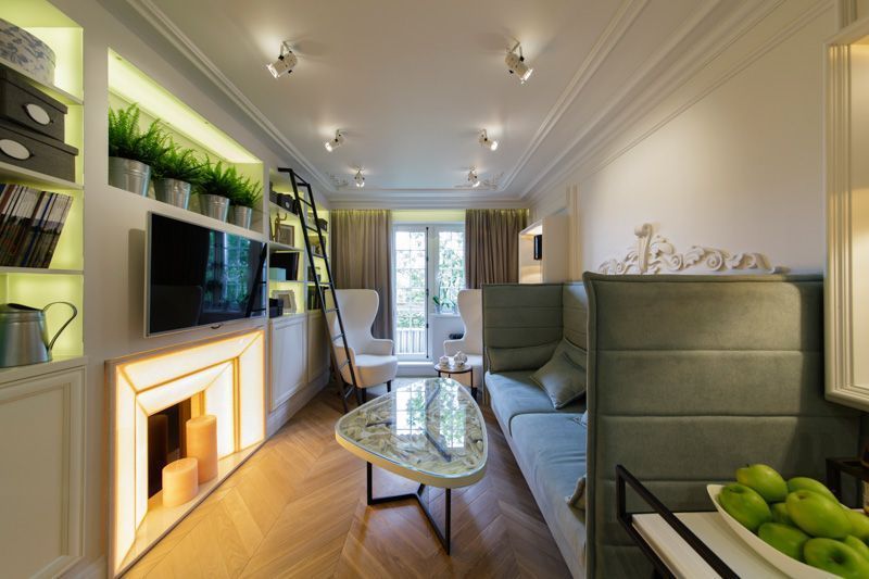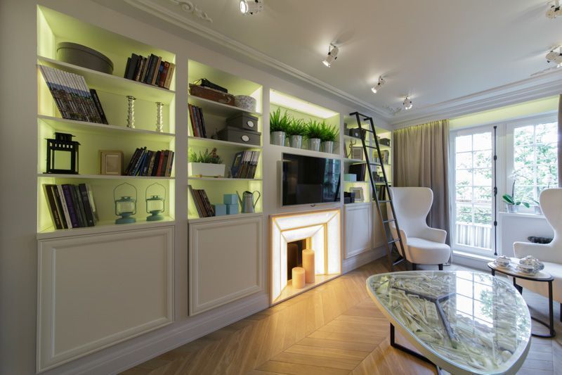 Боковые стенки (стойки) стеллажа, расположившегося вдоль одной из стен комнаты, превратили в лайтбоксы, озарившие внутренне пространство стеллажа мягким рассеянным светом. Для этого была выбрана светодиодная лента arlight® зеленого свечения, которая была установлена внутрь стенок, а затем закрыта матовыми светопропускающими рассеивателями. Такая же лента была применена для подсветки штор.