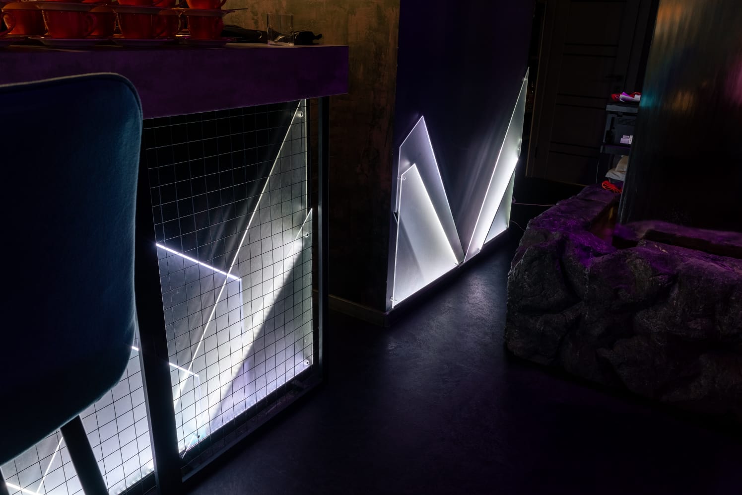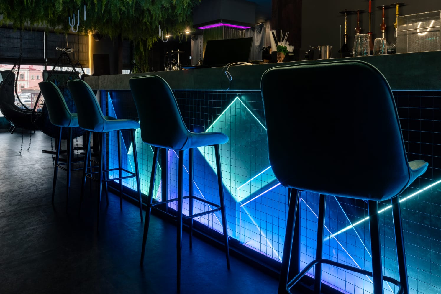 Помещение выполнено в темных тонах, что создает ощущение камерности и уюта. Однако благодаря цветной подсветке кальян-бар наполняется игривыми и даже фантастическими интонациями.
