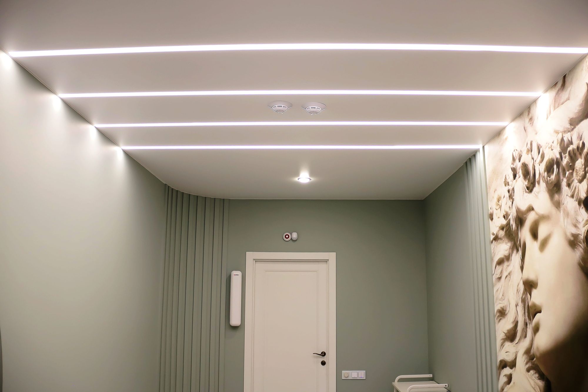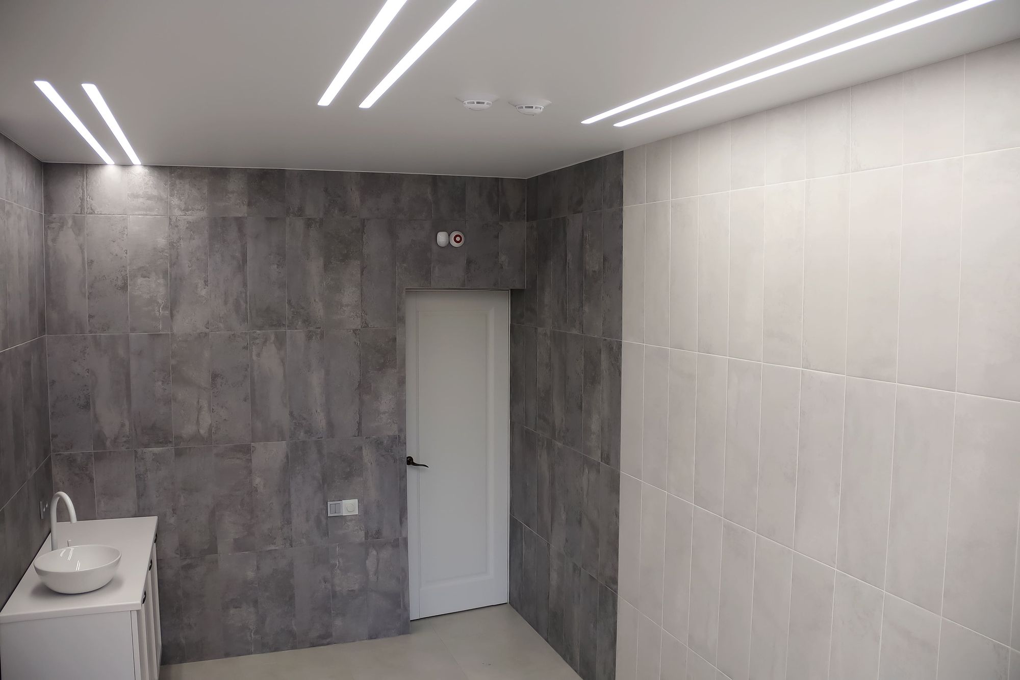 Свет в интерьере клиники соответствует общей концепции дизайна. В отделке использованы холодные оттенки белого и серого, которые подчеркиваются нейтральным дневным светом (4000 К).
