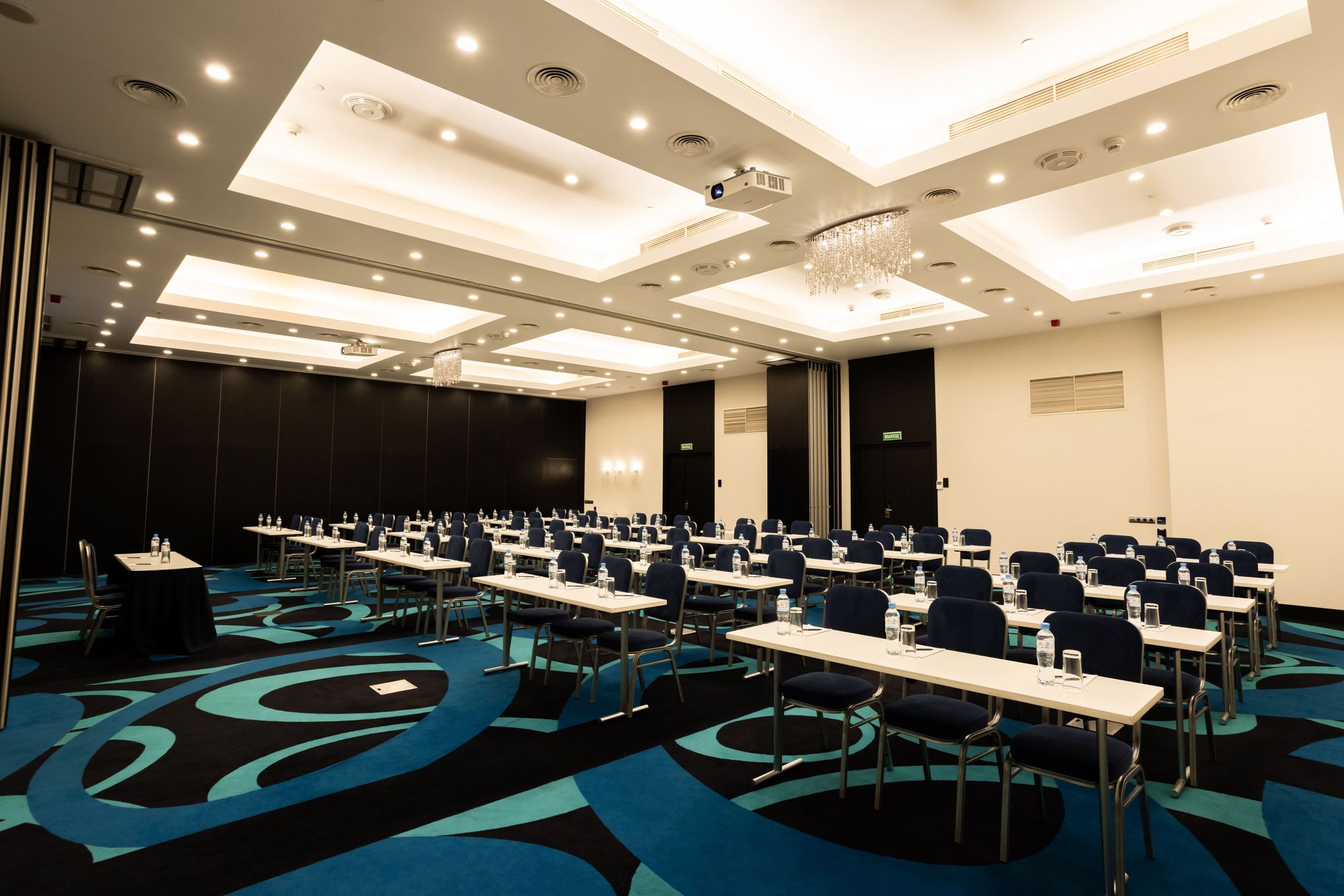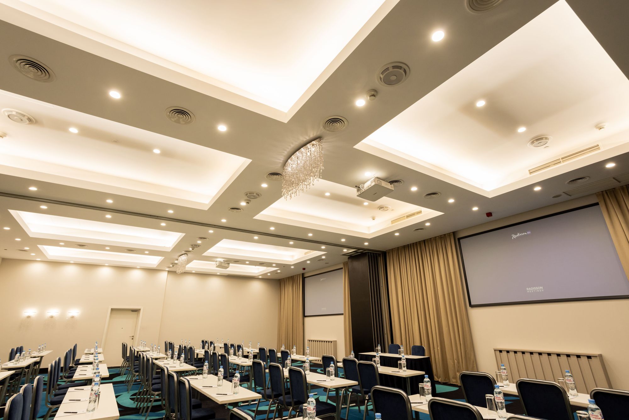 Освещение конференц-зала проектируется с учетом многофункциональности пространства: в нем проводят презентации, видеоконференции, совещания и торжественные мероприятия. Применение световых сценариев — один из ключевых пунктов для создания такого многообразия.