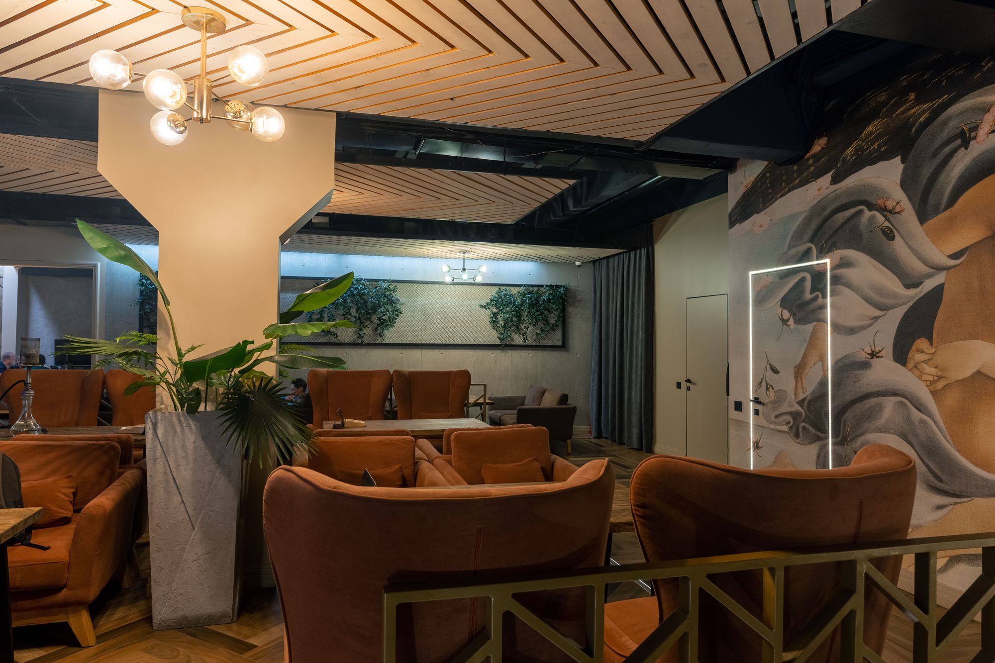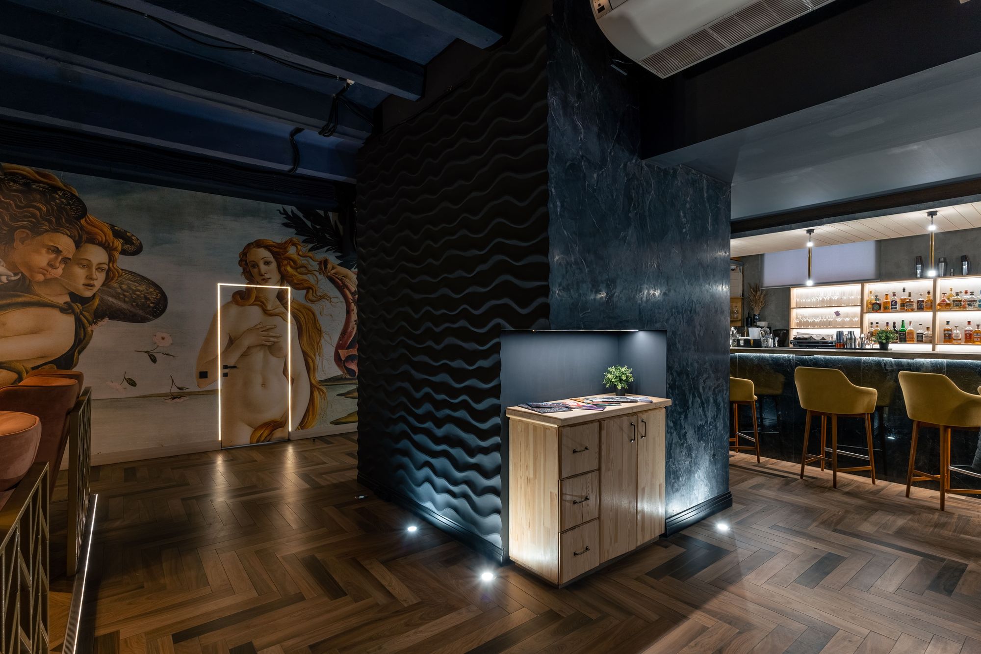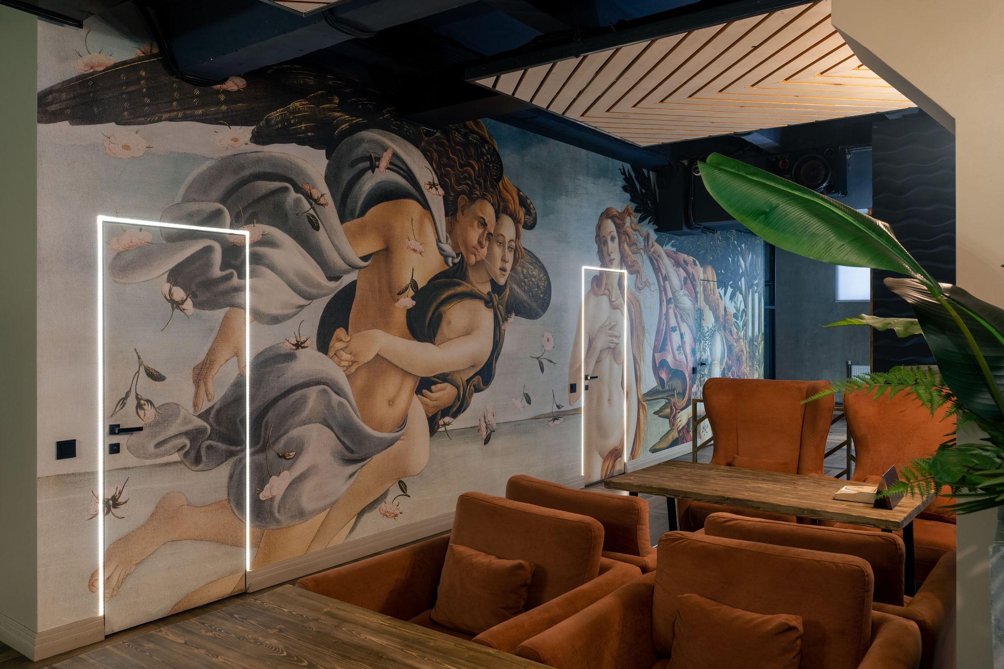 Особое внимание привлекает стена, полностью расписанная под картину «Рождение Венеры» Боттичелли. Контурная подсветка дверей не только выполняет навигационную функцию, но и создает ощущение, что из-под картины просачивается солнечный свет.