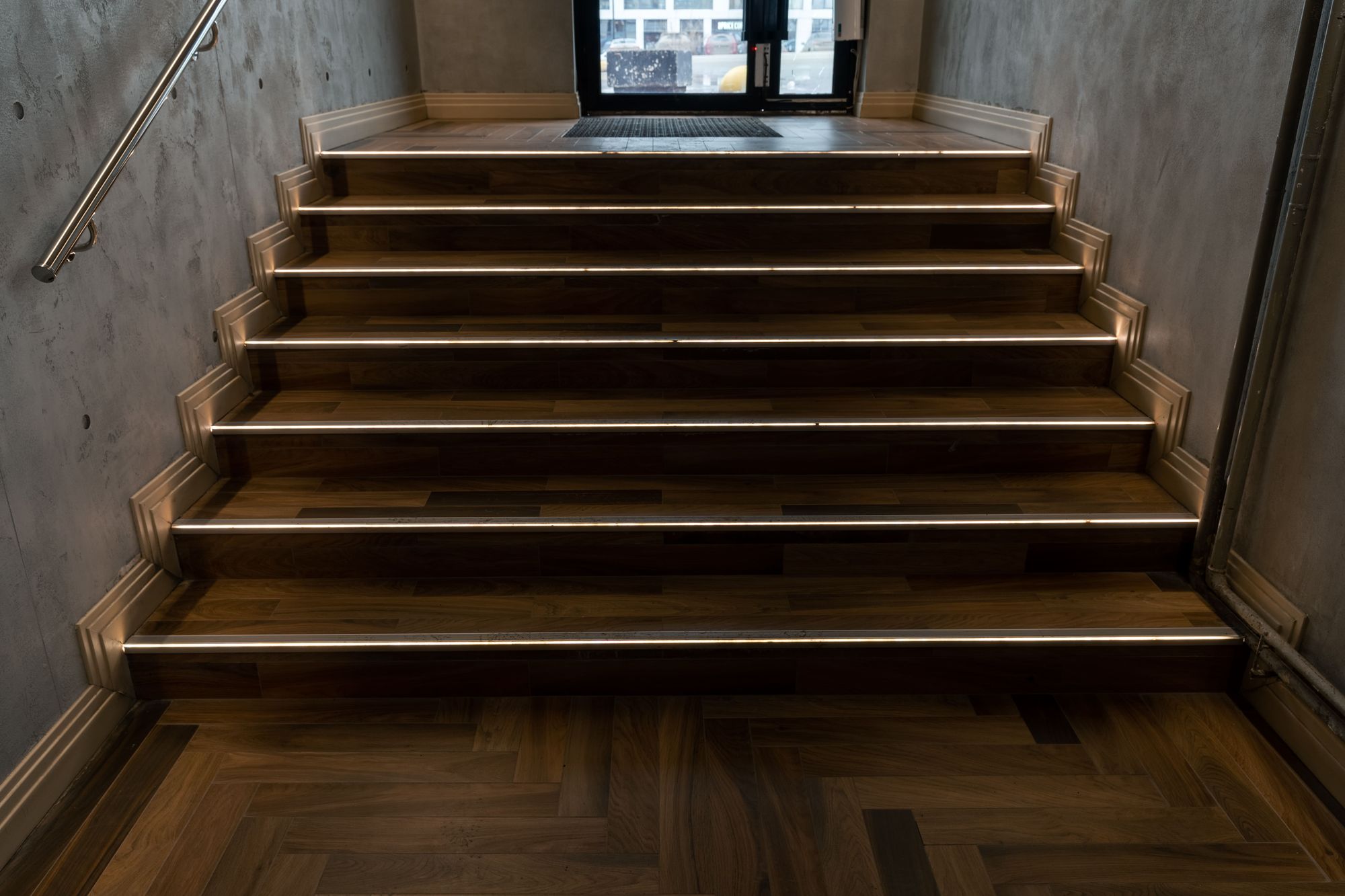 Хочется отметить подсветку лестницы, ведущей в зал. Края ступенек не только хорошо видны в полумраке, но и снабжены противоскользящей вставкой.