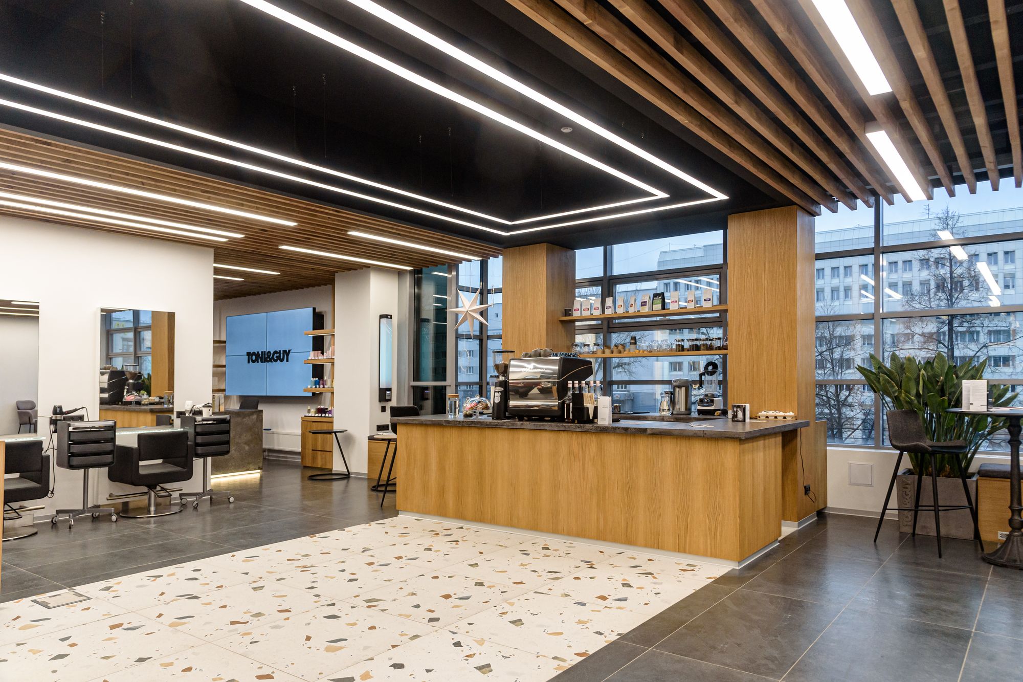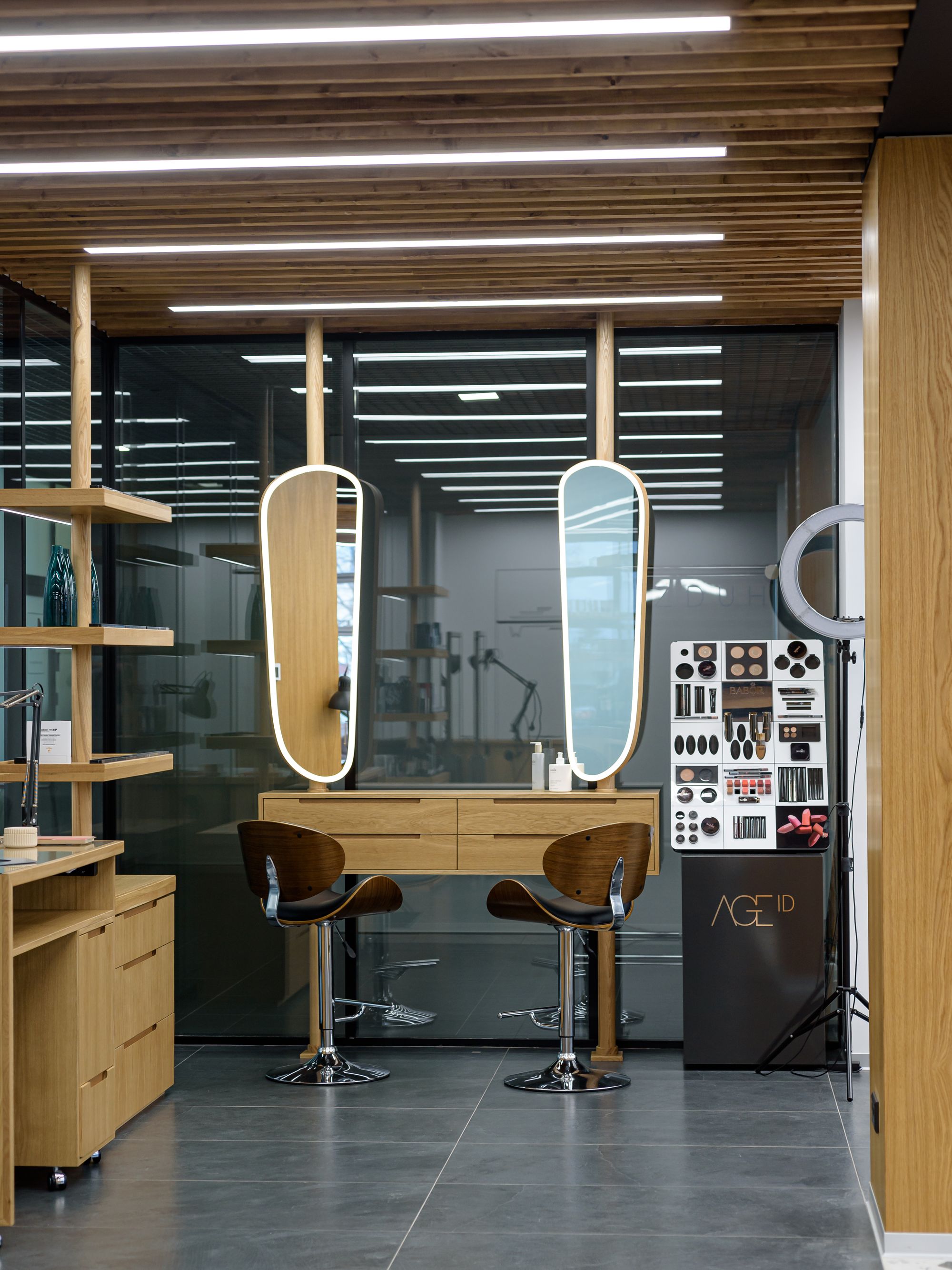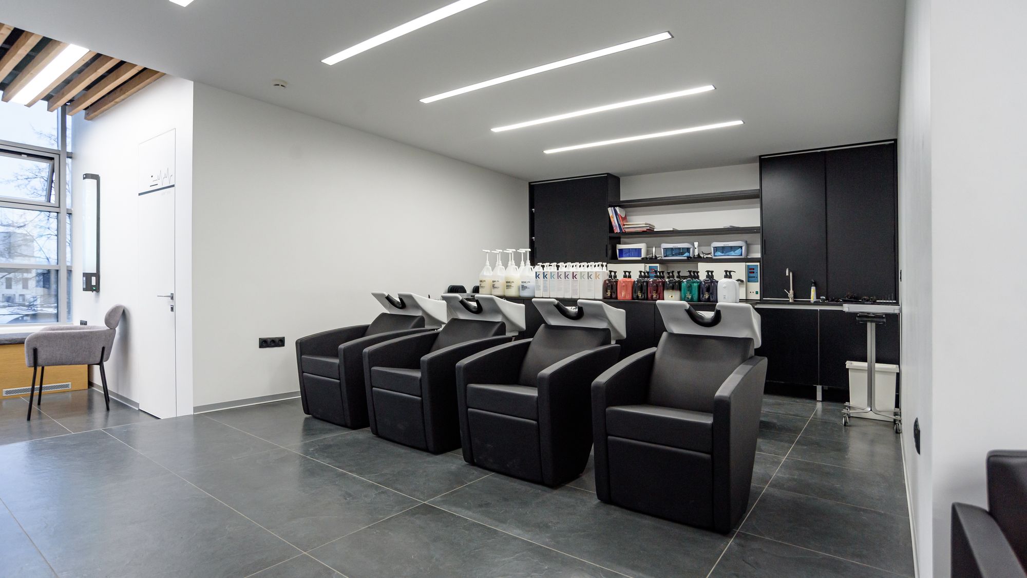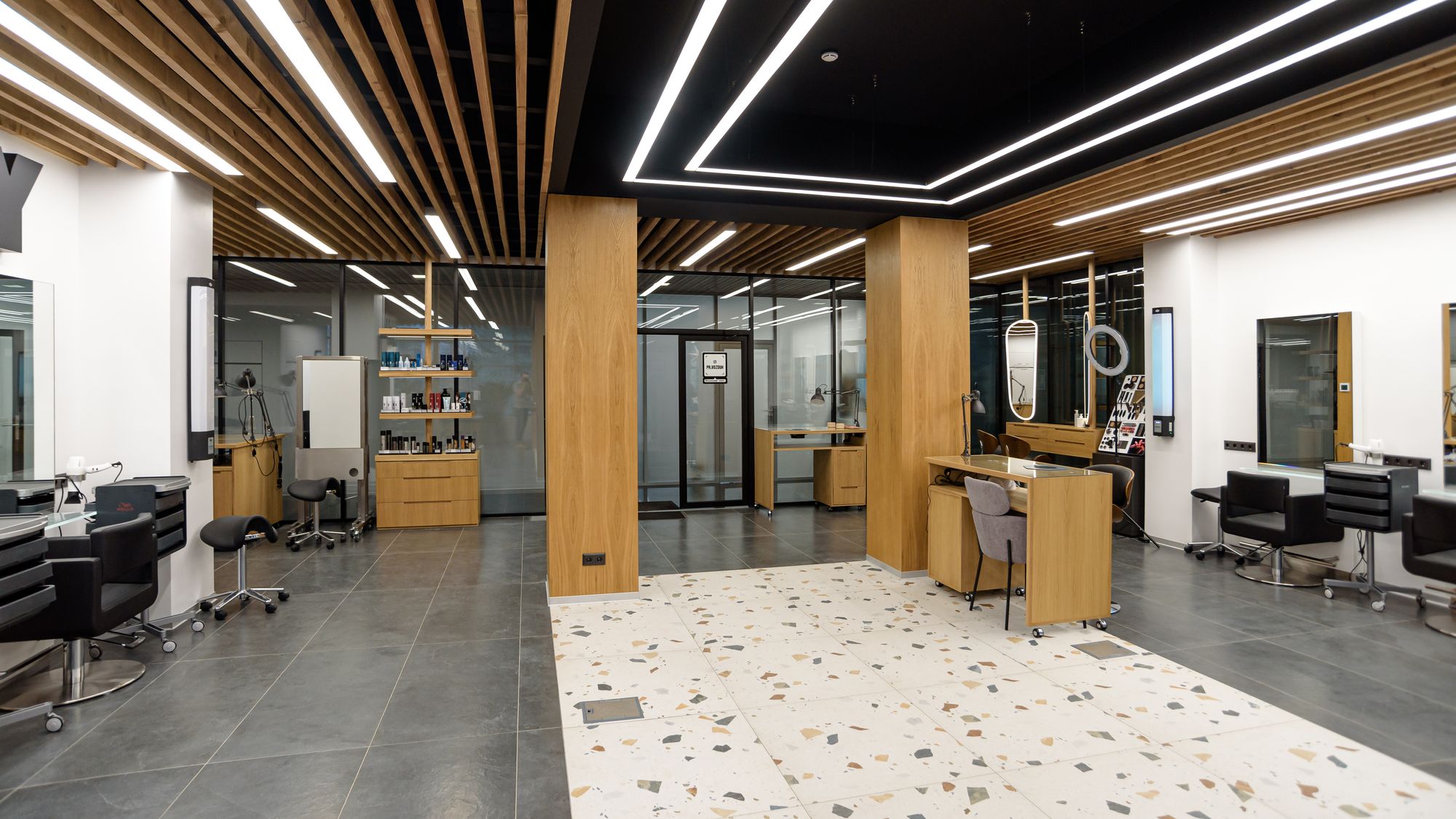 Использование профилей разной ширины и светодиодных лент дневного белого свечения позволило создать многообразие световых линий, гармонично интегрированных в деревянные потолочные перекрытия и натяжной потолок. Широкие световые полосы, отражающиеся на поверхности стеклянных стен, расширяют границы помещения. Тонкие световые линии добавляют черному глянцевому потолку стильного контраста. За счет применения лент с высоким индексом цветопередачи и матовых рассеивателей получается равномерное и яркое основное освещение. Офисная часть салона красоты освещена дизайнерскими подвесными круглыми светильниками с внутренним свечением, которые оригинально смотрятся в любых интерьерах.