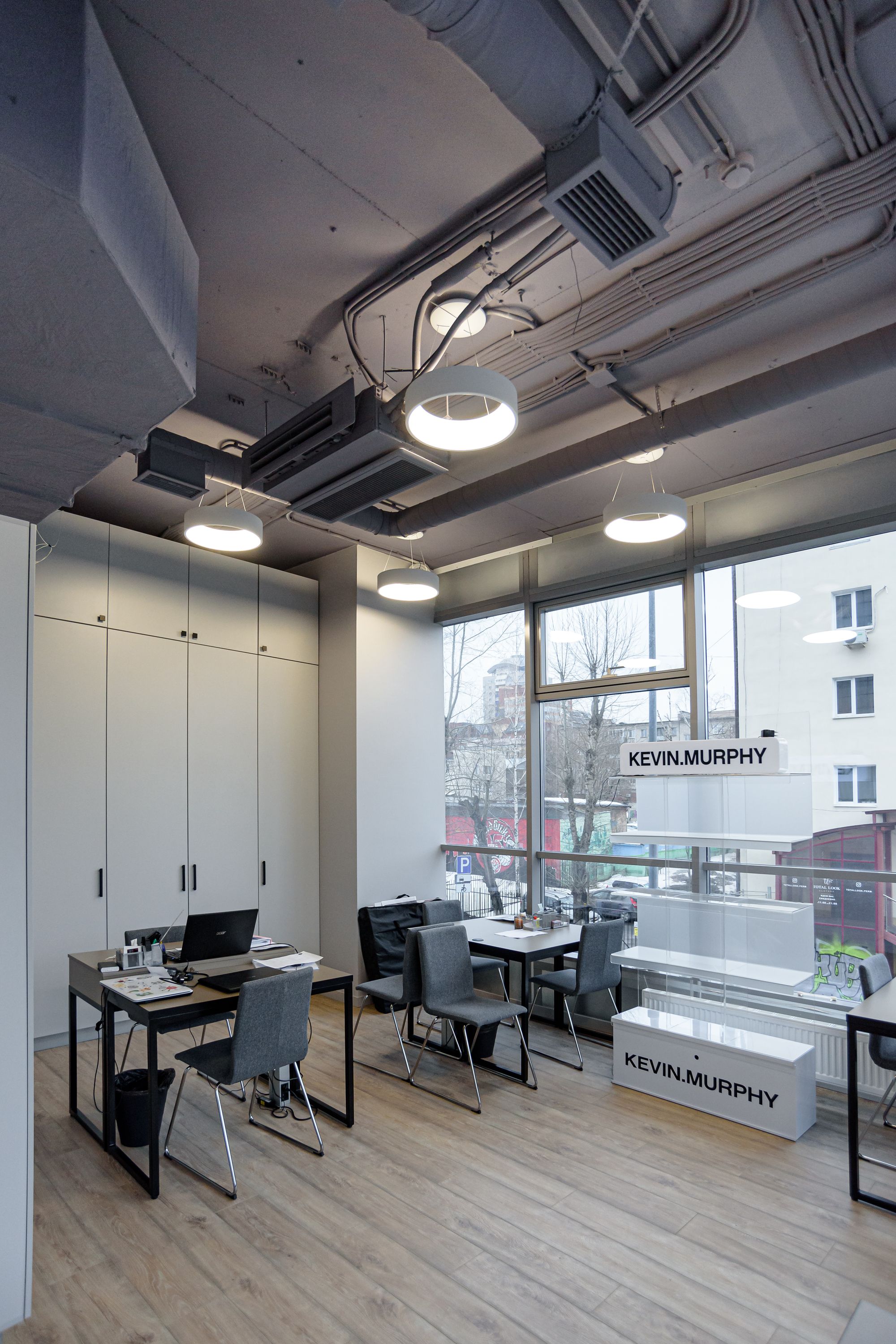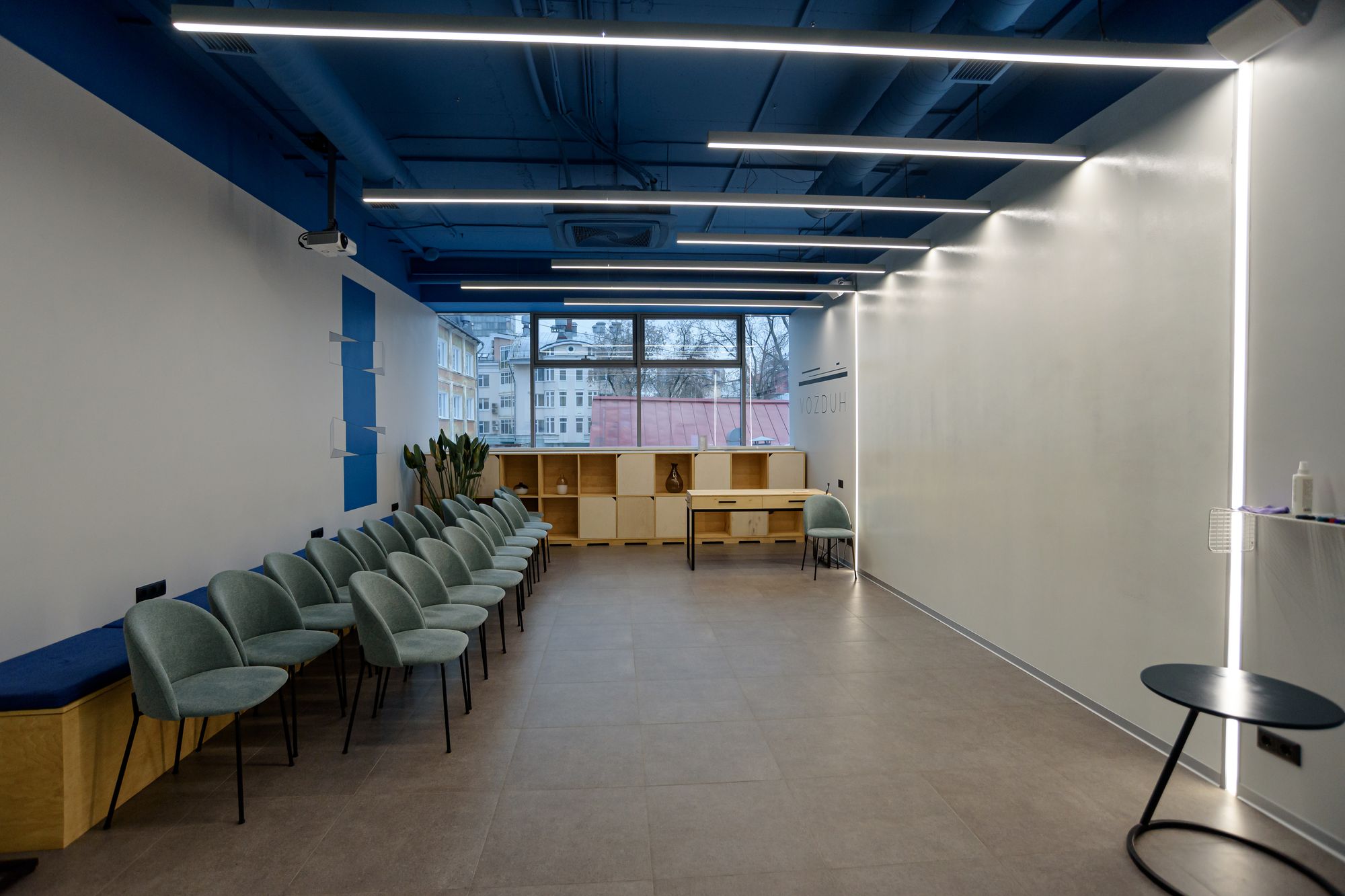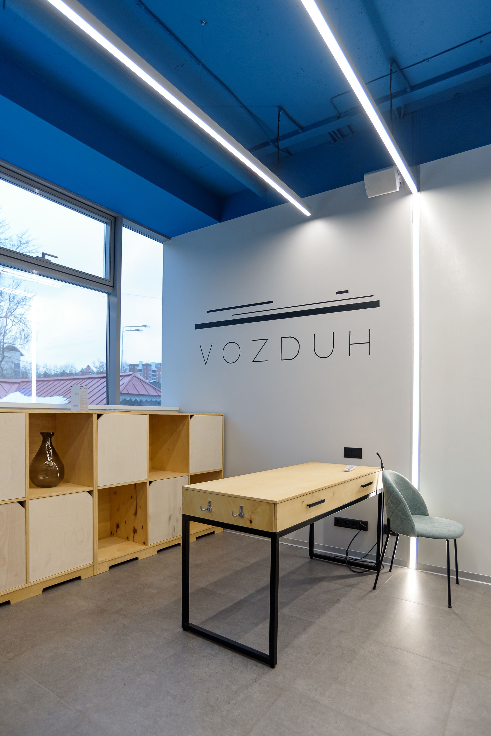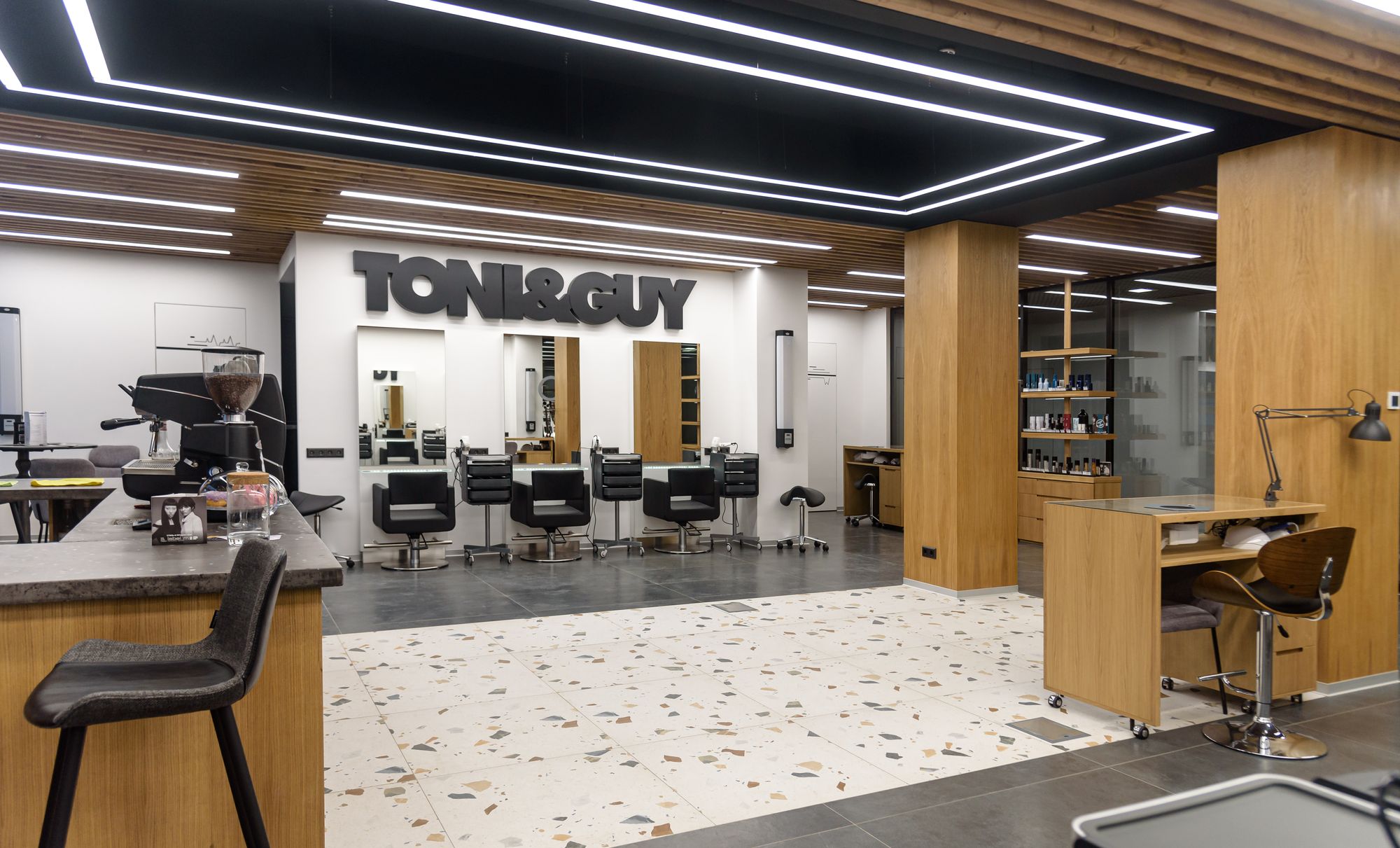 Использование профилей разной ширины и светодиодных лент дневного белого свечения позволило создать многообразие световых линий, гармонично интегрированных в деревянные потолочные перекрытия и натяжной потолок. Широкие световые полосы, отражающиеся на поверхности стеклянных стен, расширяют границы помещения. Тонкие световые линии добавляют черному глянцевому потолку стильного контраста. За счет применения лент с высоким индексом цветопередачи и матовых рассеивателей получается равномерное и яркое основное освещение. Офисная часть салона красоты освещена дизайнерскими подвесными круглыми светильниками с внутренним свечением, которые оригинально смотрятся в любых интерьерах.