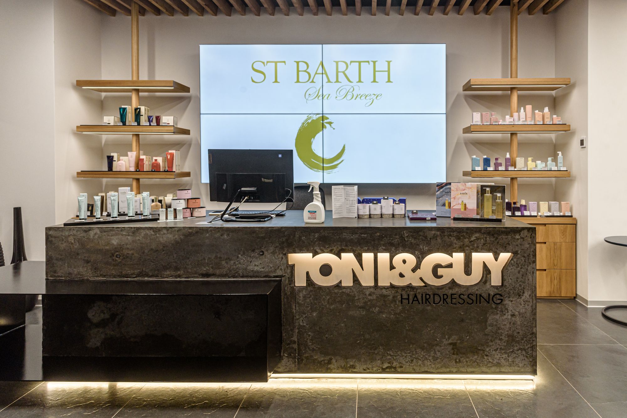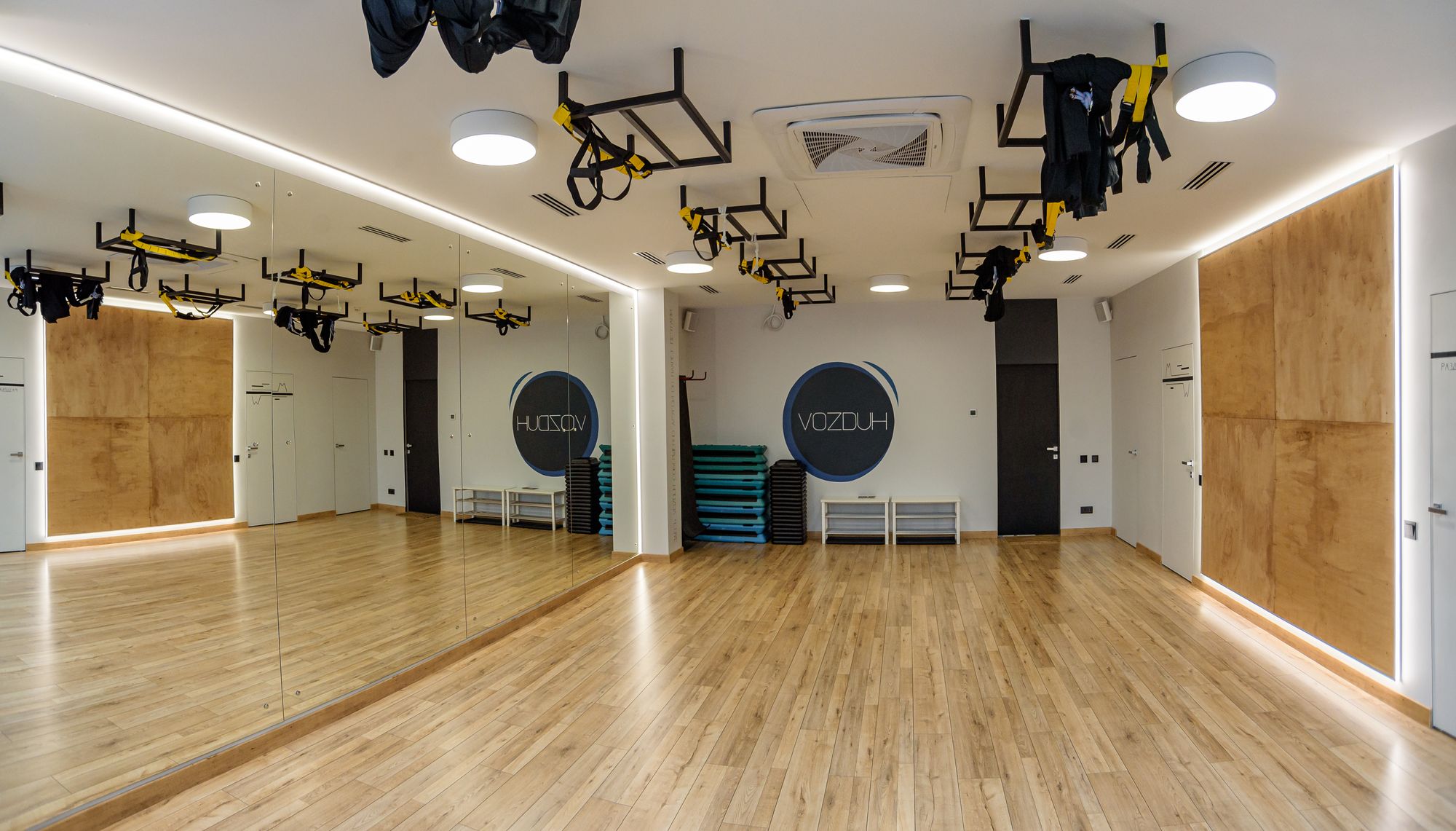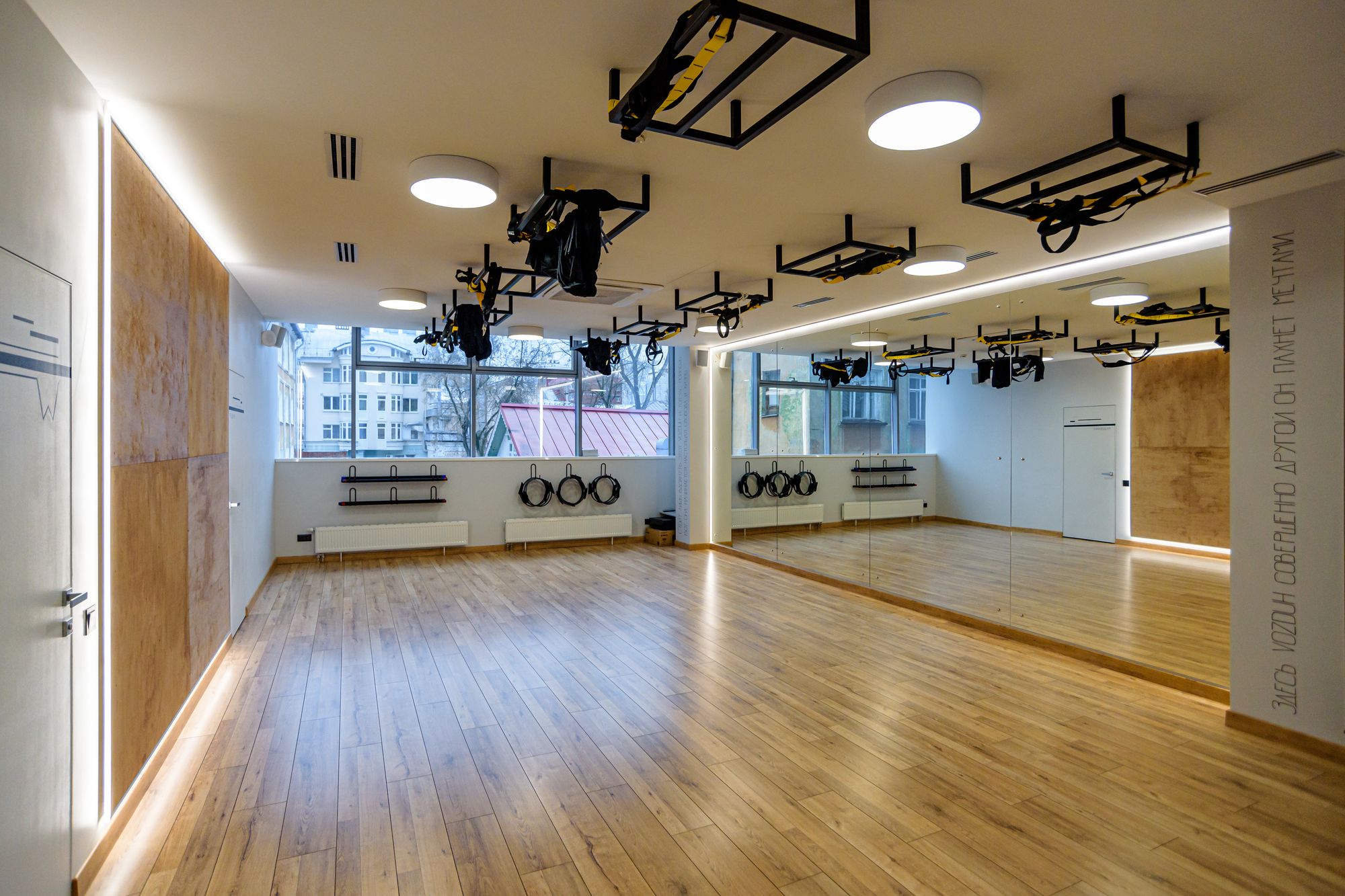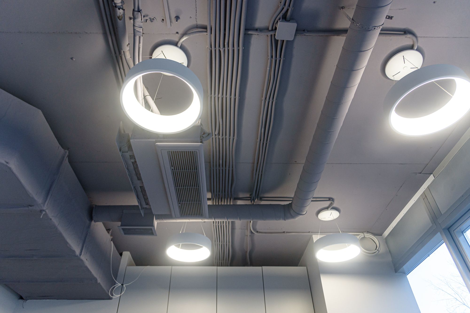 Использование профилей разной ширины и светодиодных лент дневного белого свечения позволило создать многообразие световых линий, гармонично интегрированных в деревянные потолочные перекрытия и натяжной потолок. Широкие световые полосы, отражающиеся на поверхности стеклянных стен, расширяют границы помещения. Тонкие световые линии добавляют черному глянцевому потолку стильного контраста. За счет применения лент с высоким индексом цветопередачи и матовых рассеивателей получается равномерное и яркое основное освещение. Офисная часть салона красоты освещена дизайнерскими подвесными круглыми светильниками с внутренним свечением, которые оригинально смотрятся в любых интерьерах.