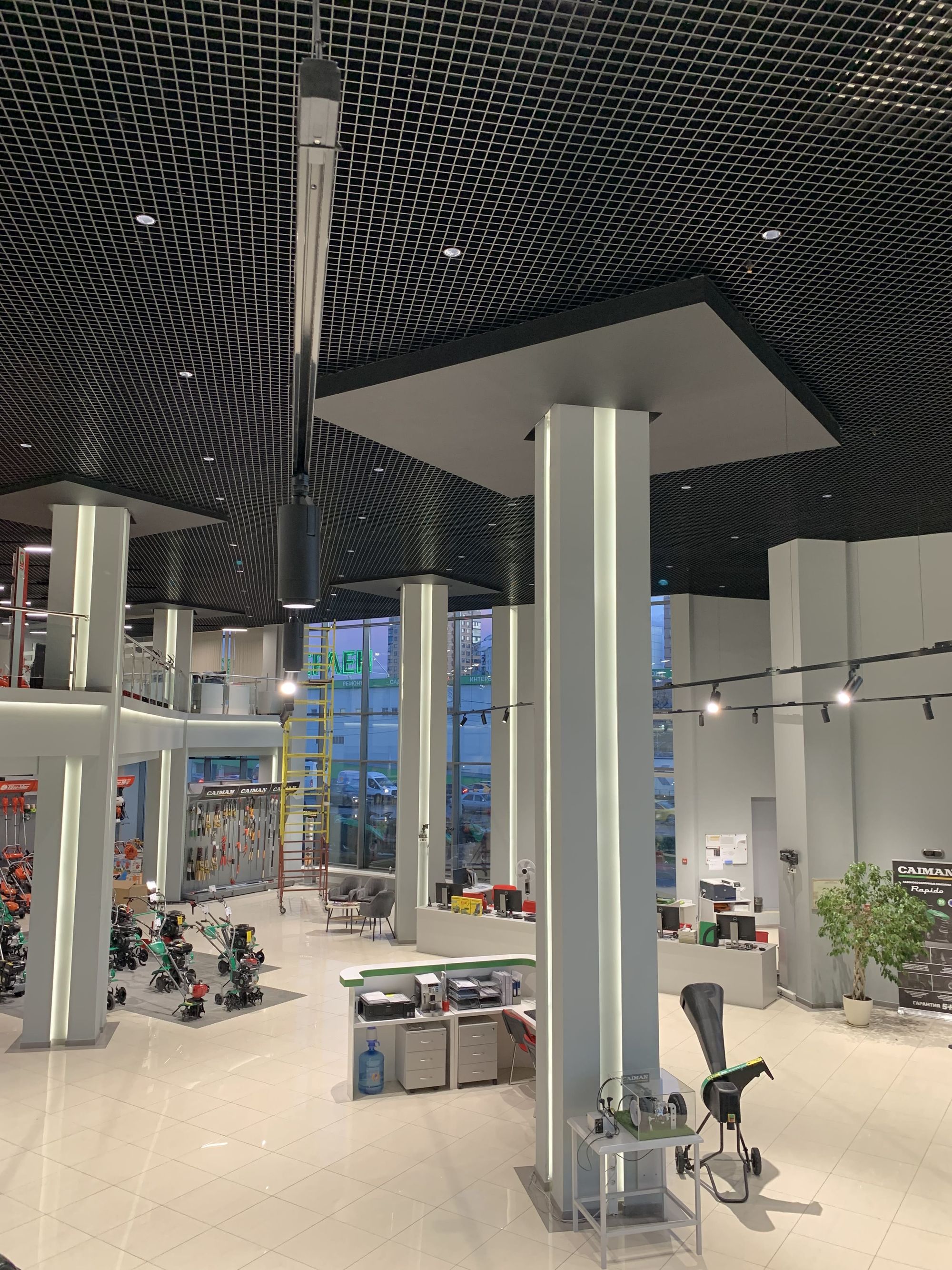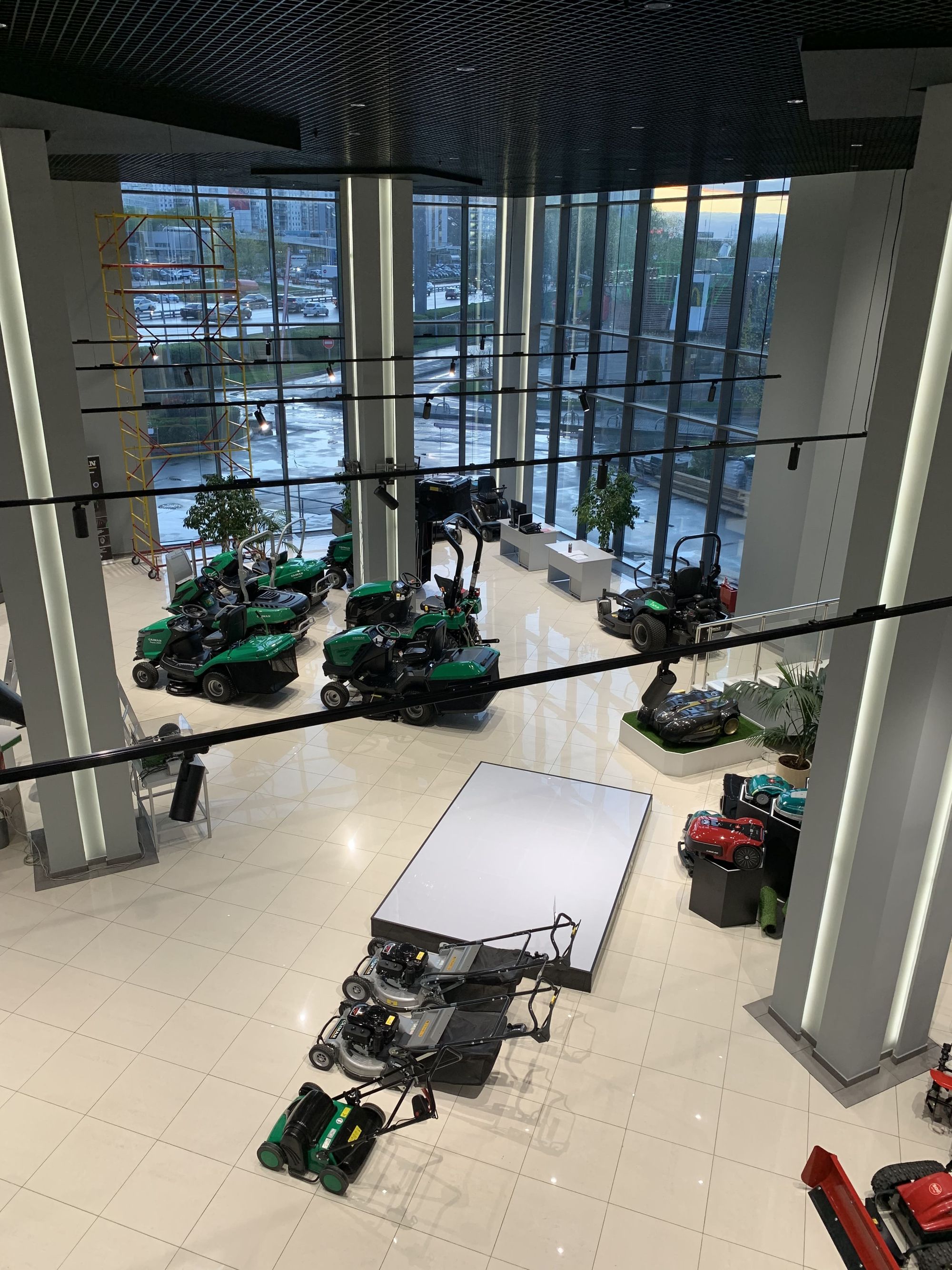 Сегодня на месте «Армстронга» — черный матовый потолок «Грильято». На его фоне линии трековых систем смотрятся стильно, подчеркивая техническую направленность шоурума. В выставочном зале с высокими потолками применяется комбинированное освещение: трековые светильники цилиндрической формы для расстановки световых акцентов и компактные встраиваемые даунлайты на потолке для основного освещения. Такое сочетание позволило создать в шоуруме гармоничный и комфортный свет для осмотра садового оборудования.