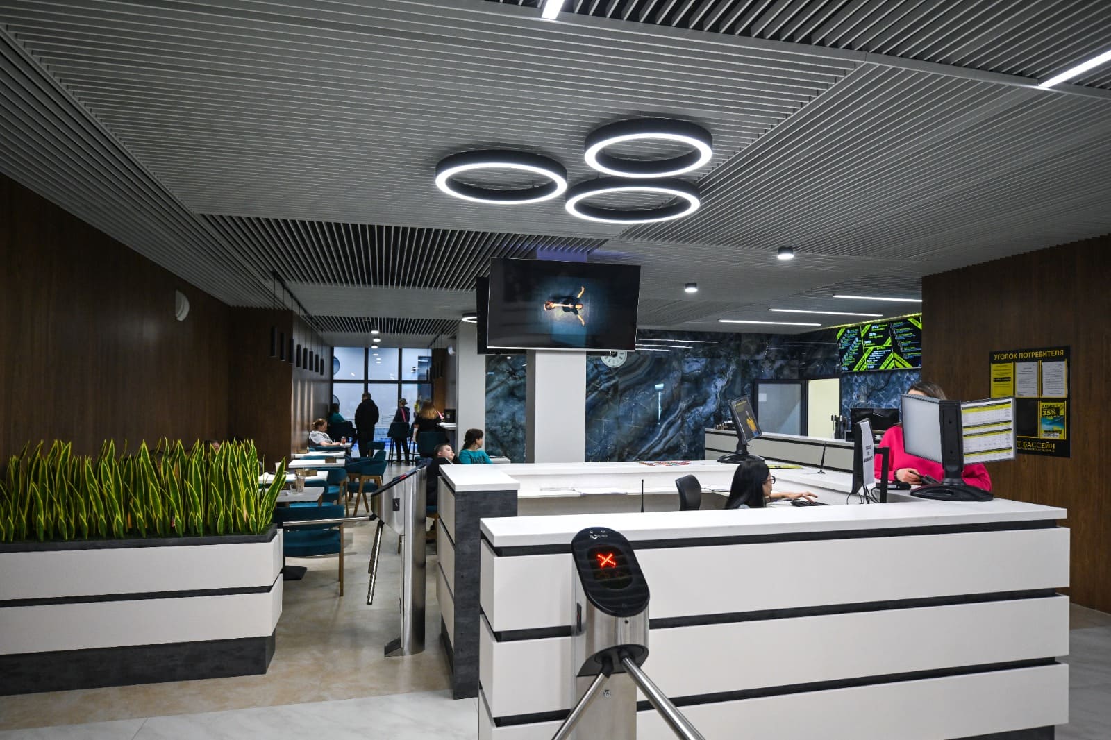 Сердце спорткомплекса — бассейн — освещается множеством светильников, выполненных на основе круглого профиля ROUND. Подвесные светильники со свечением 360° — отличное решение для потолков с открытыми коммуникациями: они не только легко устанавливаются, но и перетягивают внимание на себя. Матовые экраны ROUND образуют приятное рассеянное свечение, которое не создает резких бликов на воде.