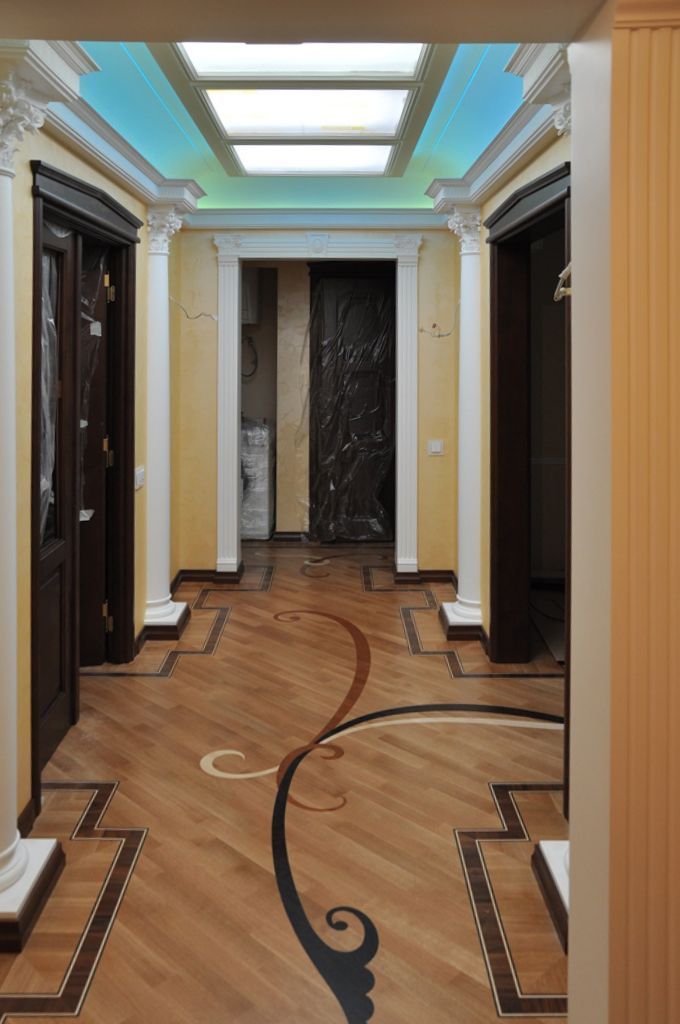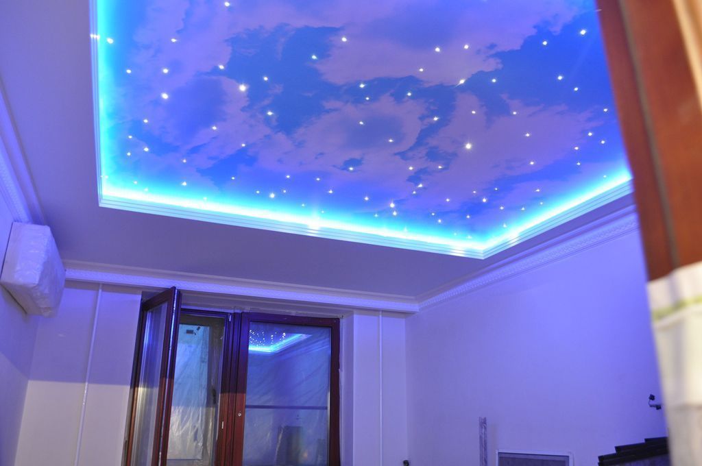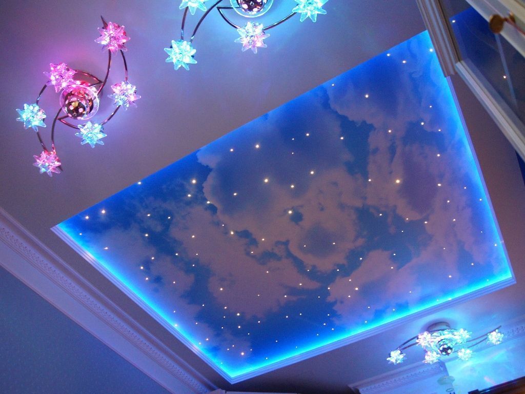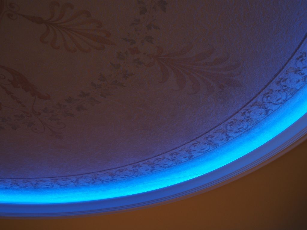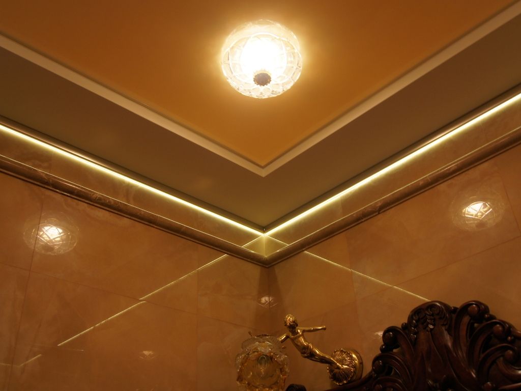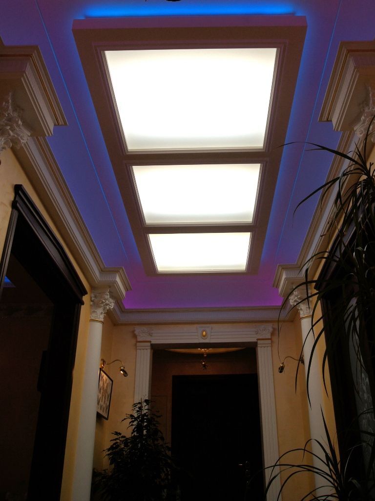 В данном проекте сочетание закарнизной многоцветной подсветки и основного освещения на основе классических люстр помогло создать особенный интерьер. Для освещения коридора были применены многоуровневые потолки со светодиодной RGB лентой. В детской комнате было создано звездное небо с многоцветной контурной подсветкой светодиодной лентой и необычными светильниками, меняющими свет за счет примененных в них RGB светодиодов.