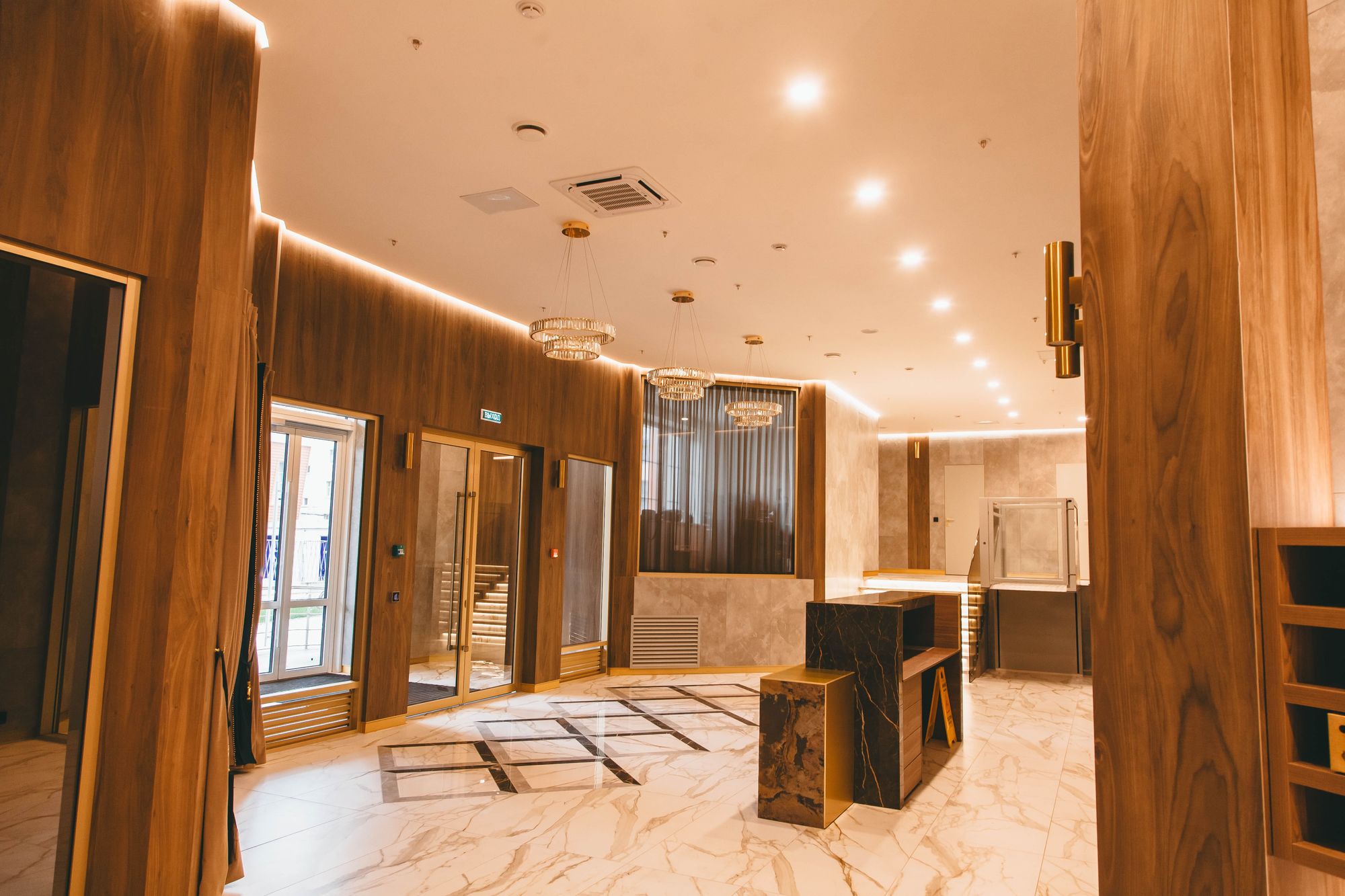 Отделка одного из лобби в ЖК «Москва» выполнена с помощью каменного шпона, что придает интерьеру определенный статус. Однако, чтобы пространство не казалось тяжеловесным и перегруженным, потолок по периметру очерчен линией света. Это не только подчеркивает сложную геометрию помещения, но и наполняет пространство воздухом.